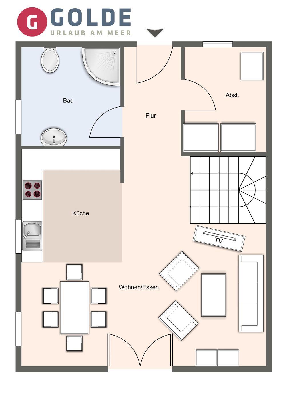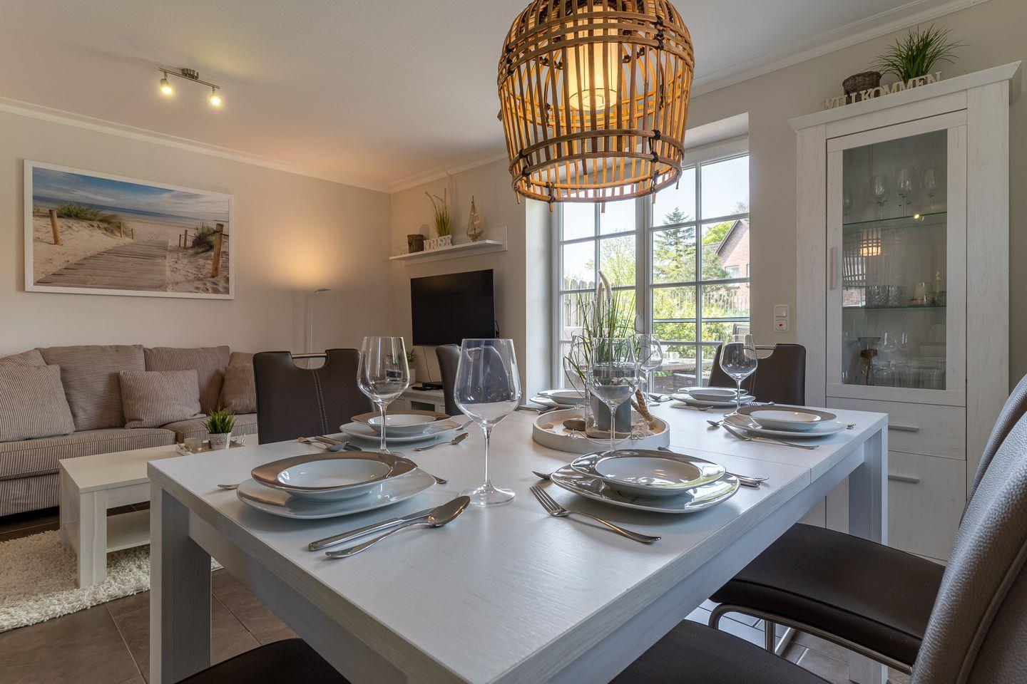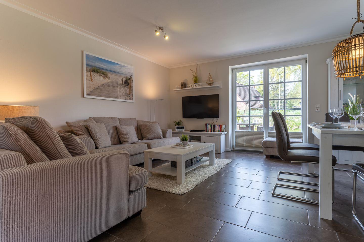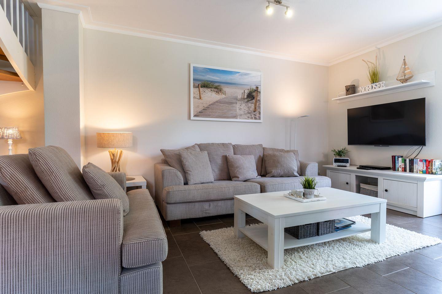 Im Erdgeschoss befindet sich der lichtdurchflutete Wohnraum mit TV sowie einem Essbereich.
