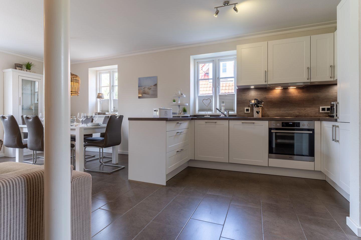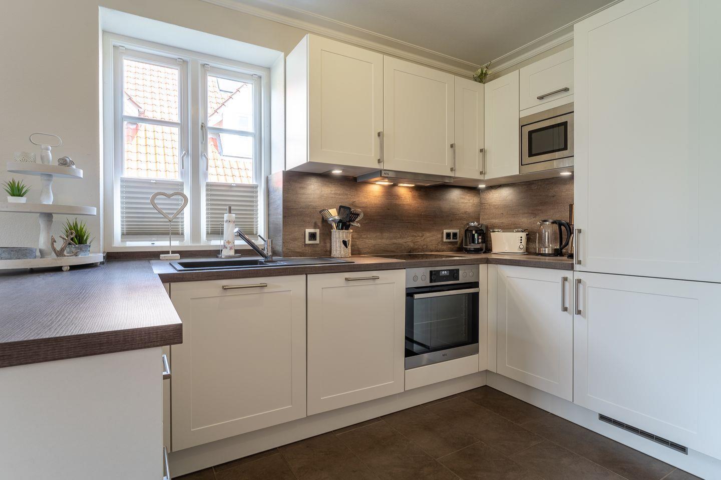 Die Küche verfügt über hochwertige Elektrogeräte und genügend Platz zum gemeinsamen Kochen.