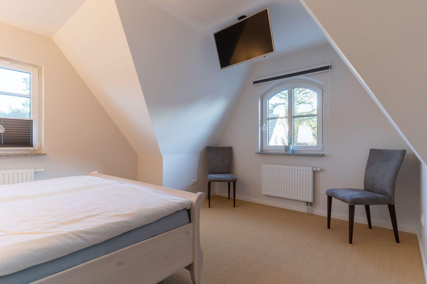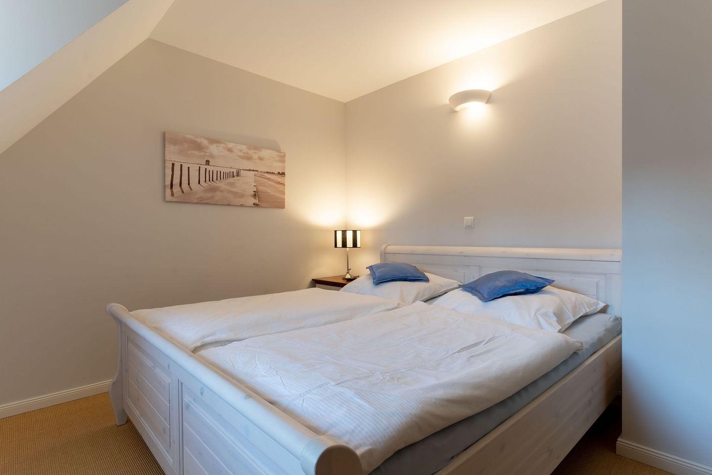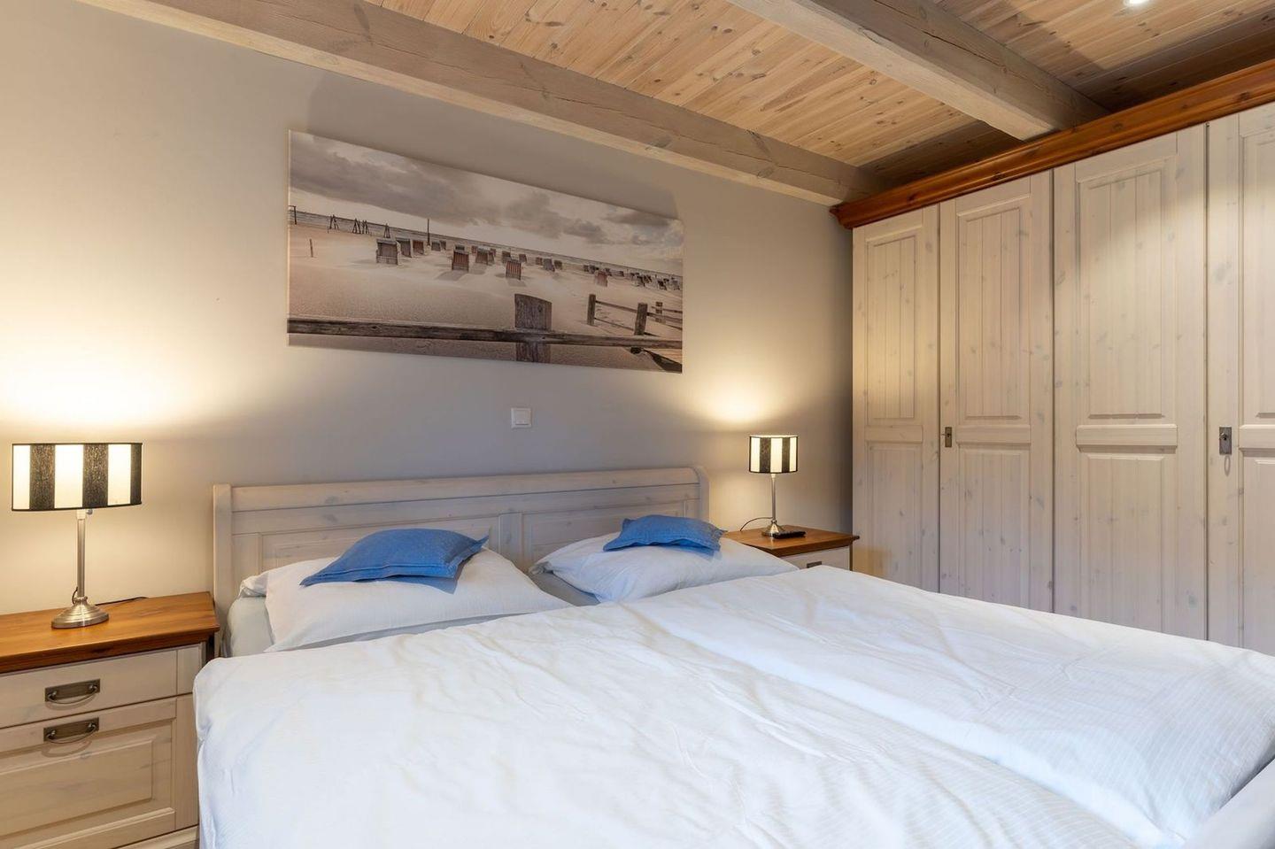 Über eine Holztreppe gelangt man in das Obergeschoss. Die beiden Schlafzimmer, jeweils mit einem Doppelbett sorgen für ruhevolle Erholung.