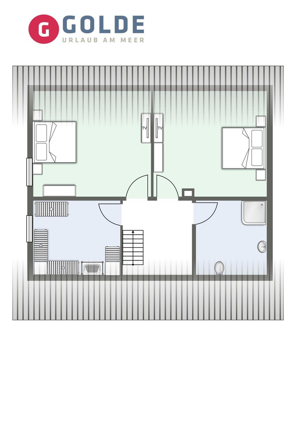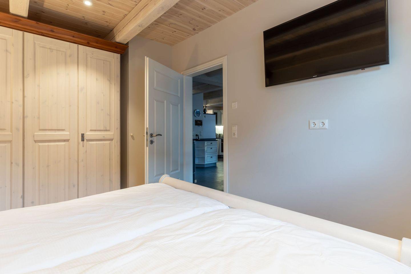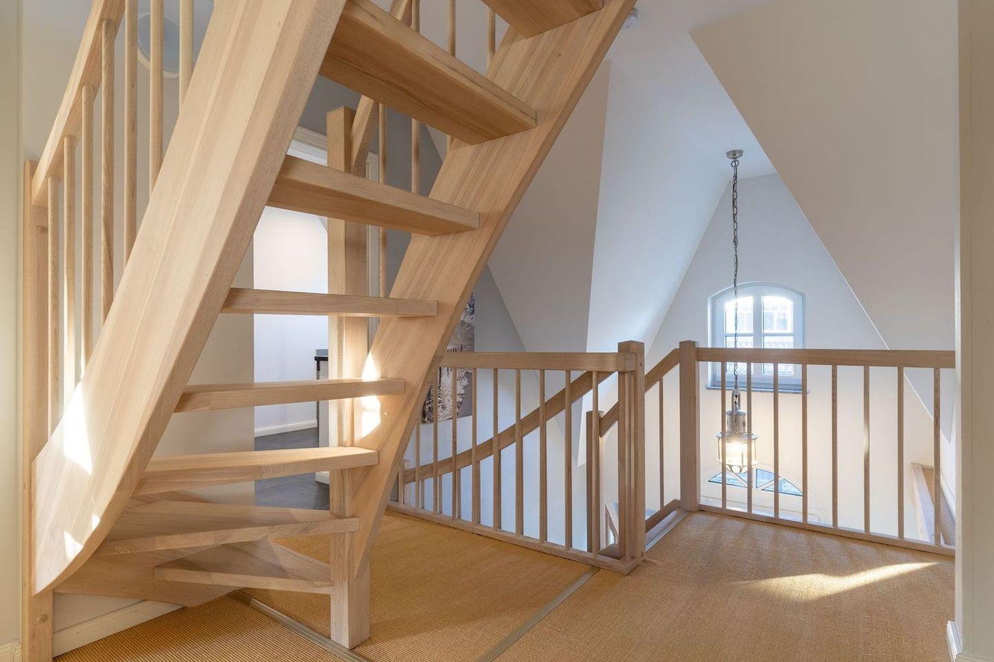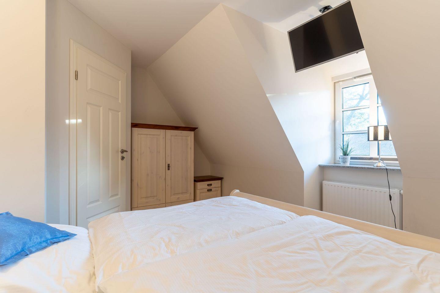 Über eine Holztreppe gelangt man in das Obergeschoss. Die beiden Schlafzimmer, jeweils mit einem Doppelbett sorgen für ruhevolle Erholung.