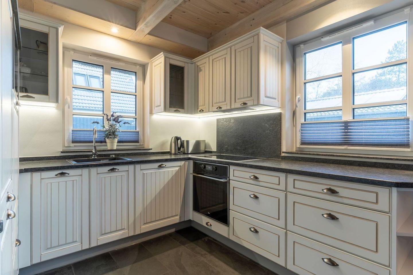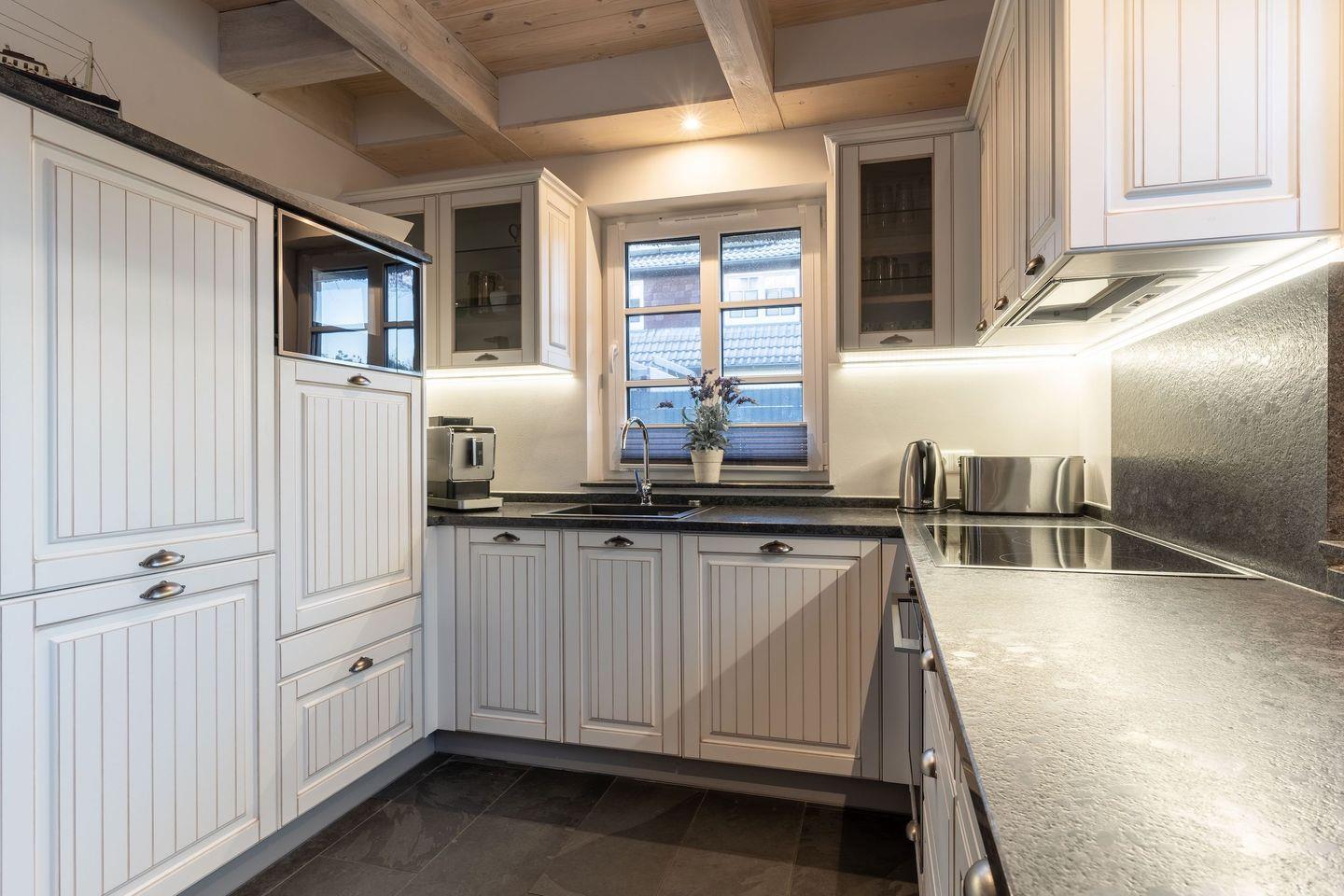Die Küche ist ausgestattet mit Backofen und Geschirrspüler, sowie einem Esperto-Caffè-Automat, Toaster, Wasserkocher und den üblichen Küchenutensilien.