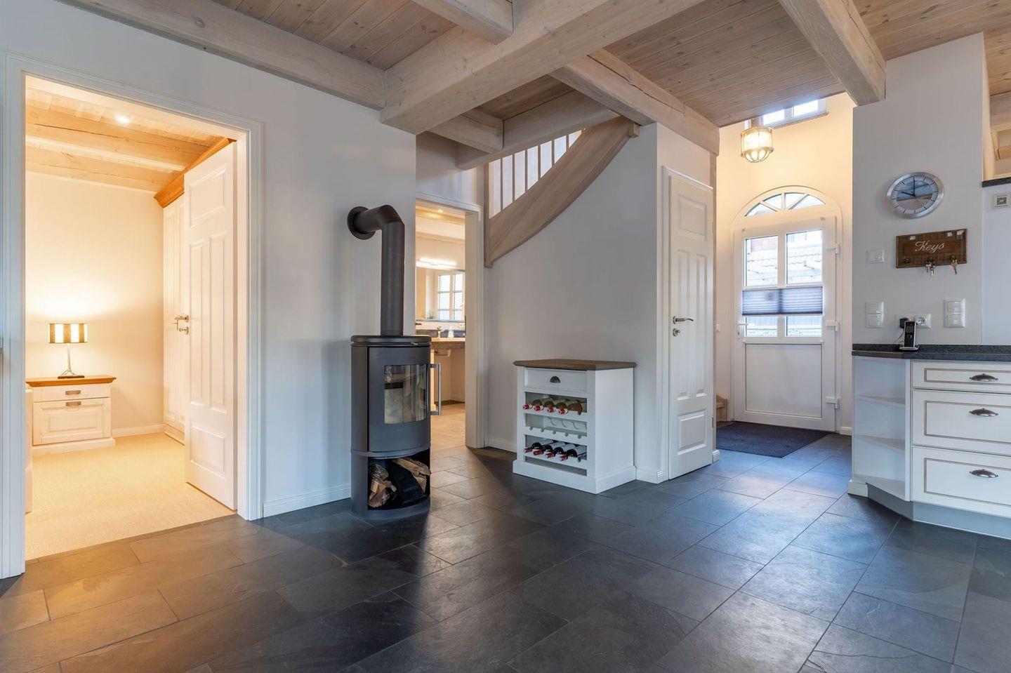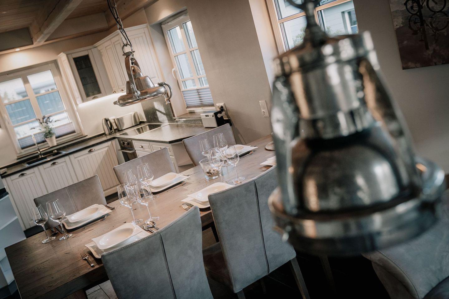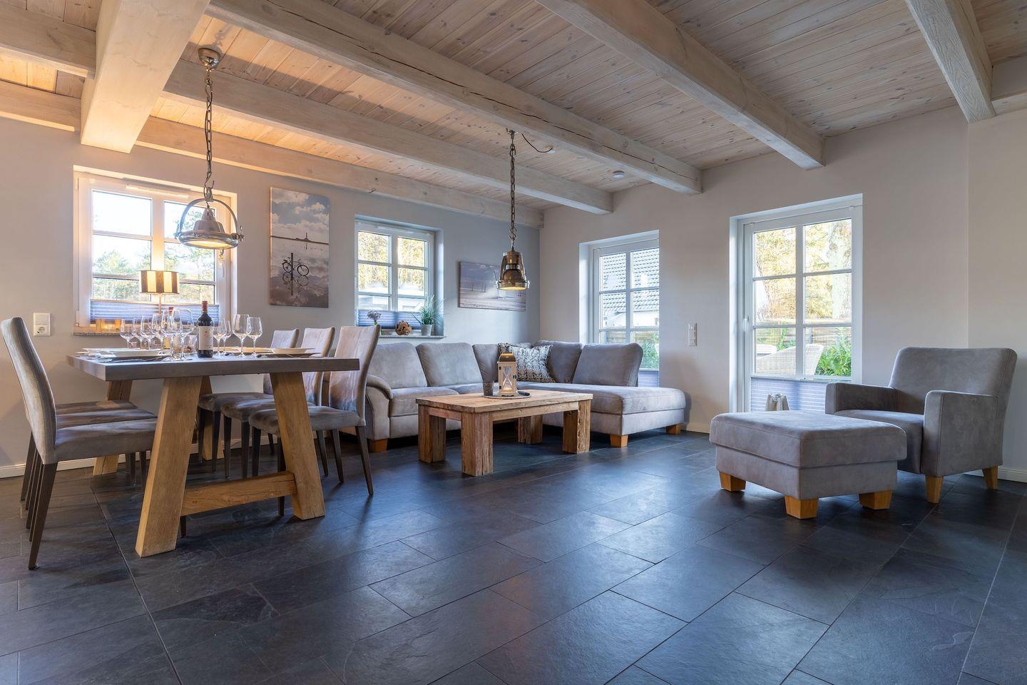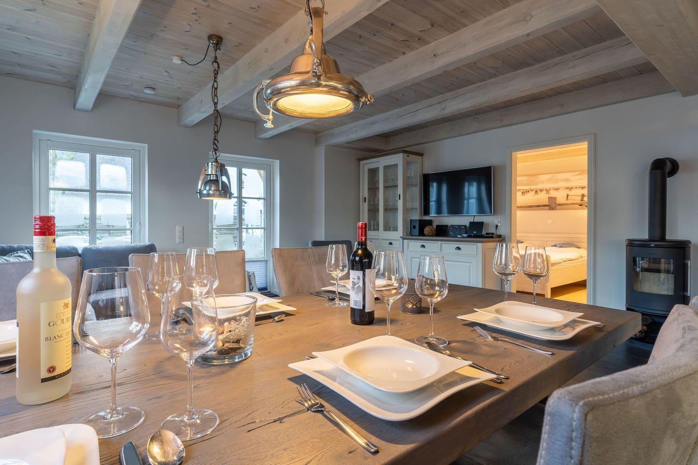 Im Erdgeschoss befindet sich der lichtdurchflutete Wohnraum mit TV, Kamin, einer offenen Küche sowie einem stilvollen Essbereich.