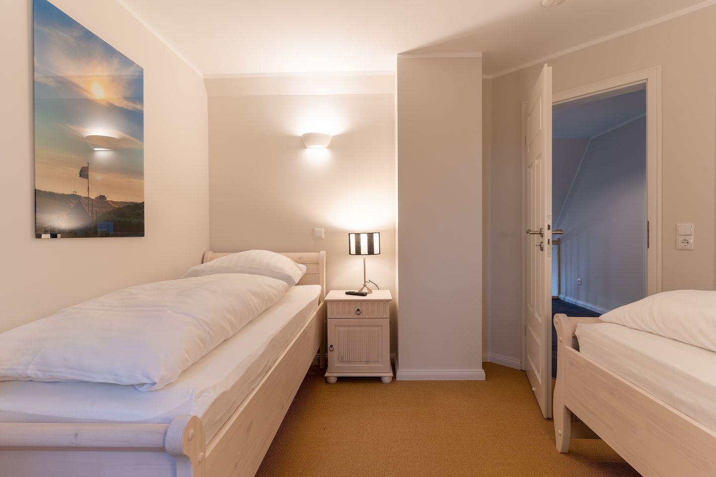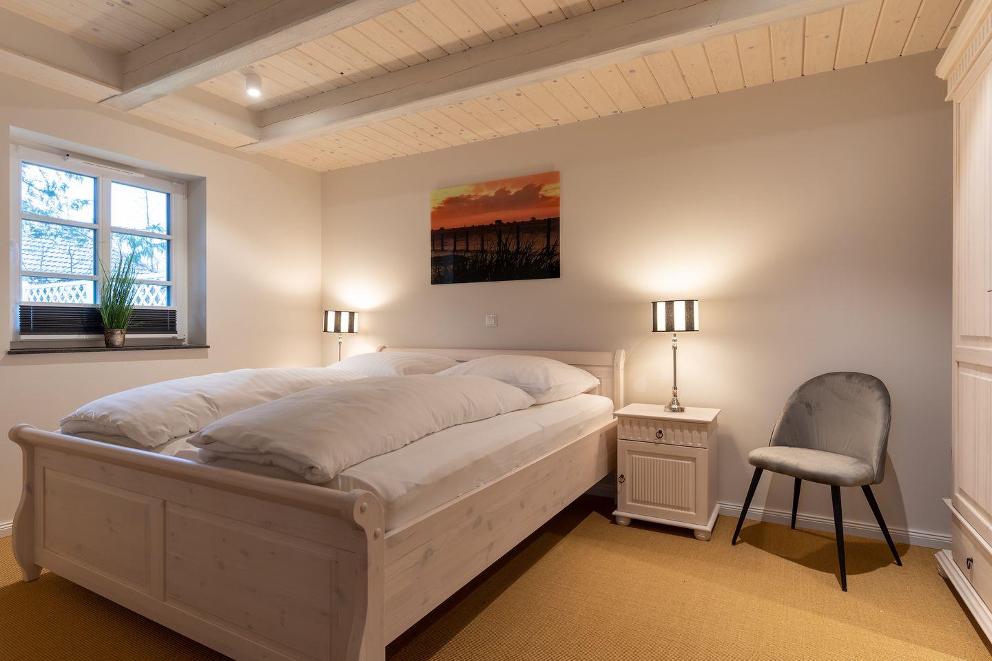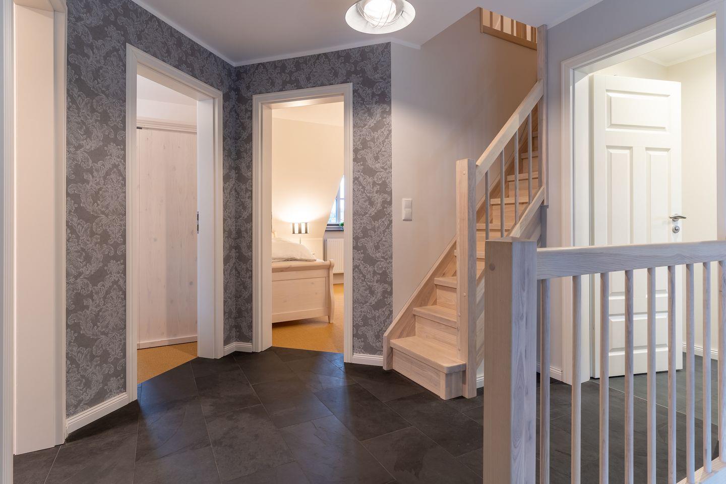 Über eine Holztreppe gelangt man in das Obergeschoss. Hier befinden sich ein Schlafzimmer mit einem Doppelbett und ein Schlafzimmer mit 2 Einzelbetten.