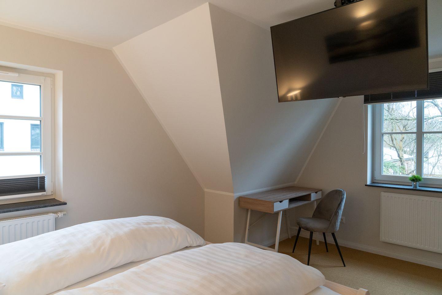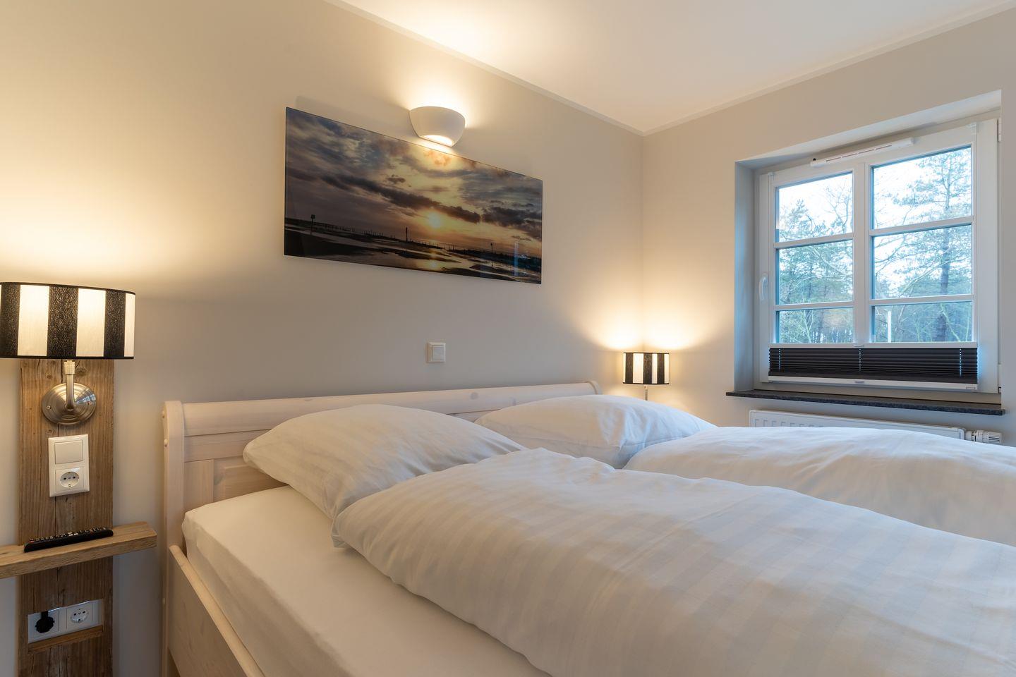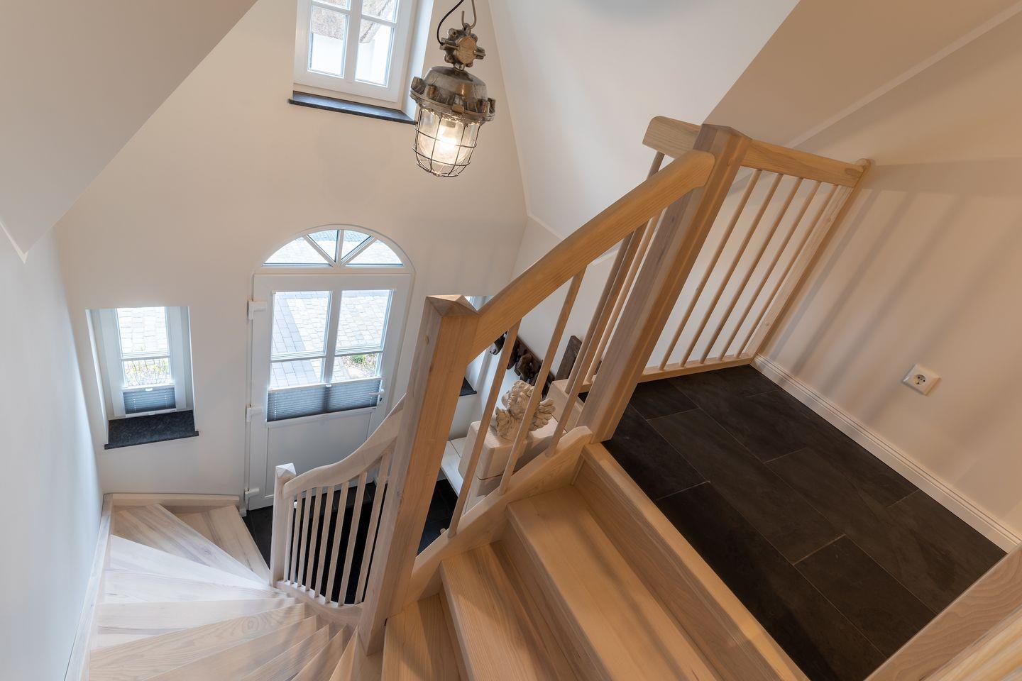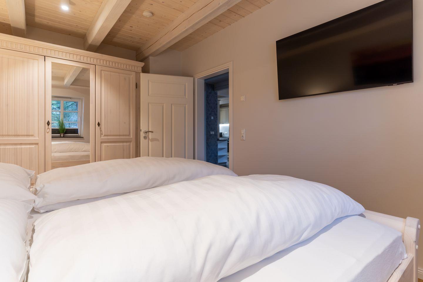 Über eine Holztreppe gelangt man in das Obergeschoss. Hier befinden sich ein Schlafzimmer mit einem Doppelbett und ein Schlafzimmer mit 2 Einzelbetten.