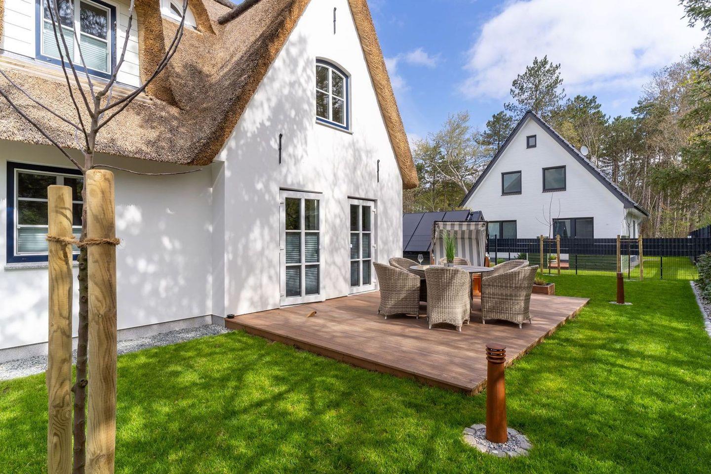 Auf der großen Terrasse steht ein Strandkorb und ein großer runder Tisch mit Gartenstühlen zur Verfügung.