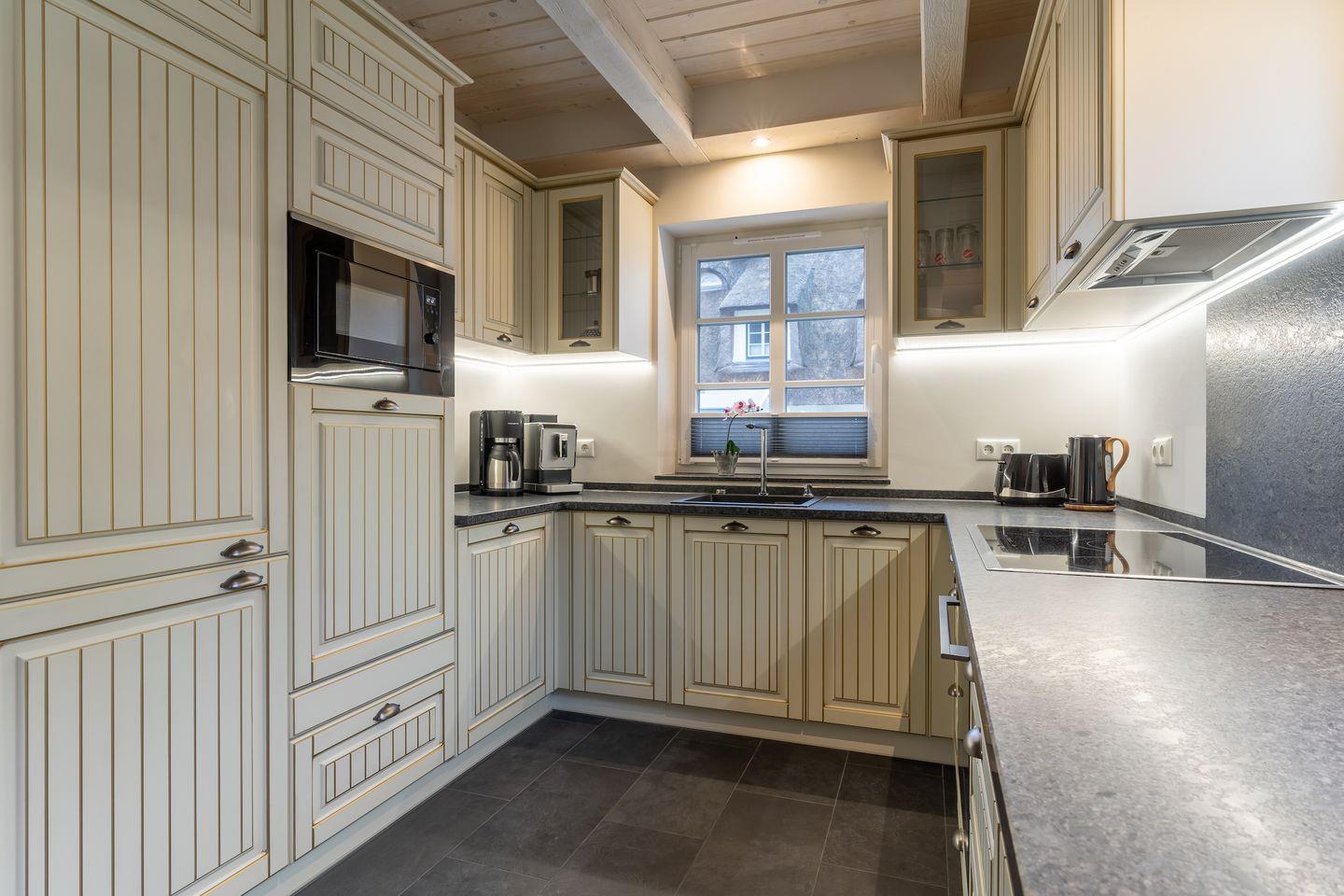 Die Küche ist ausgestattet mit Backofen und Geschirrspüler, sowie einem Esperto-Caffè-Automat, Toaster, Wasserkocher und den üblichen Küchenutensilien.
