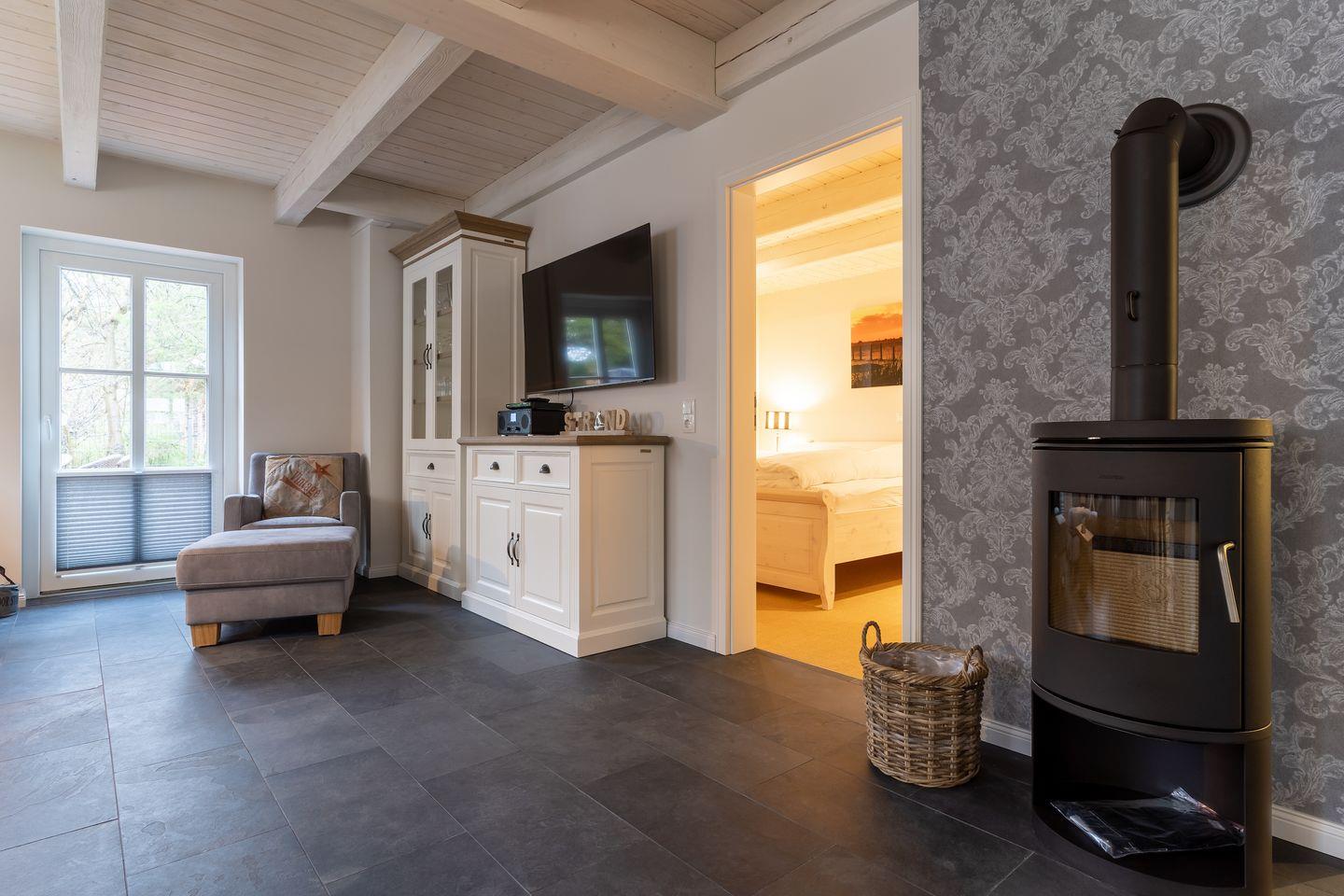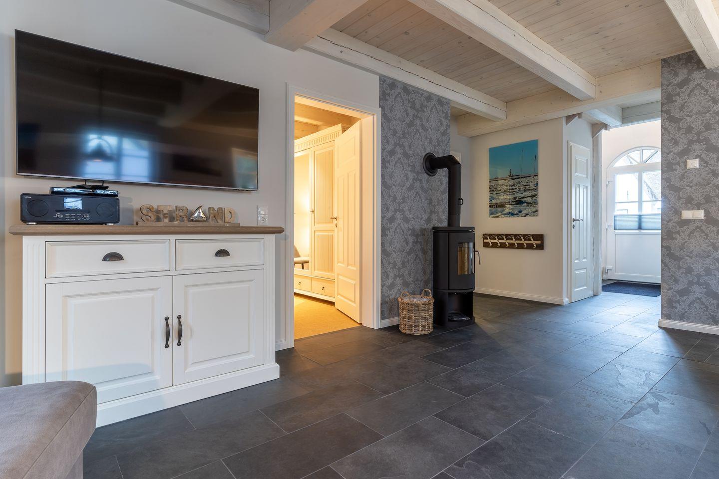 Im Erdgeschoss befindet sich der lichtdurchflutete Wohnraum mit TV, Kamin, einer offenen Küche sowie einem stilvollen Essbereich.