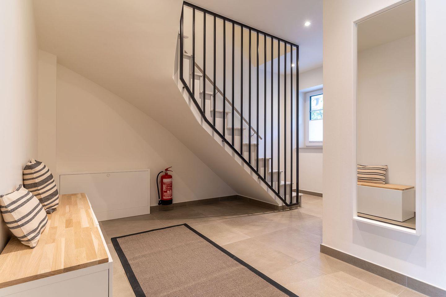 Über eine runde Raumspartreppe geht es vom Flur ins Dachgeschoss.