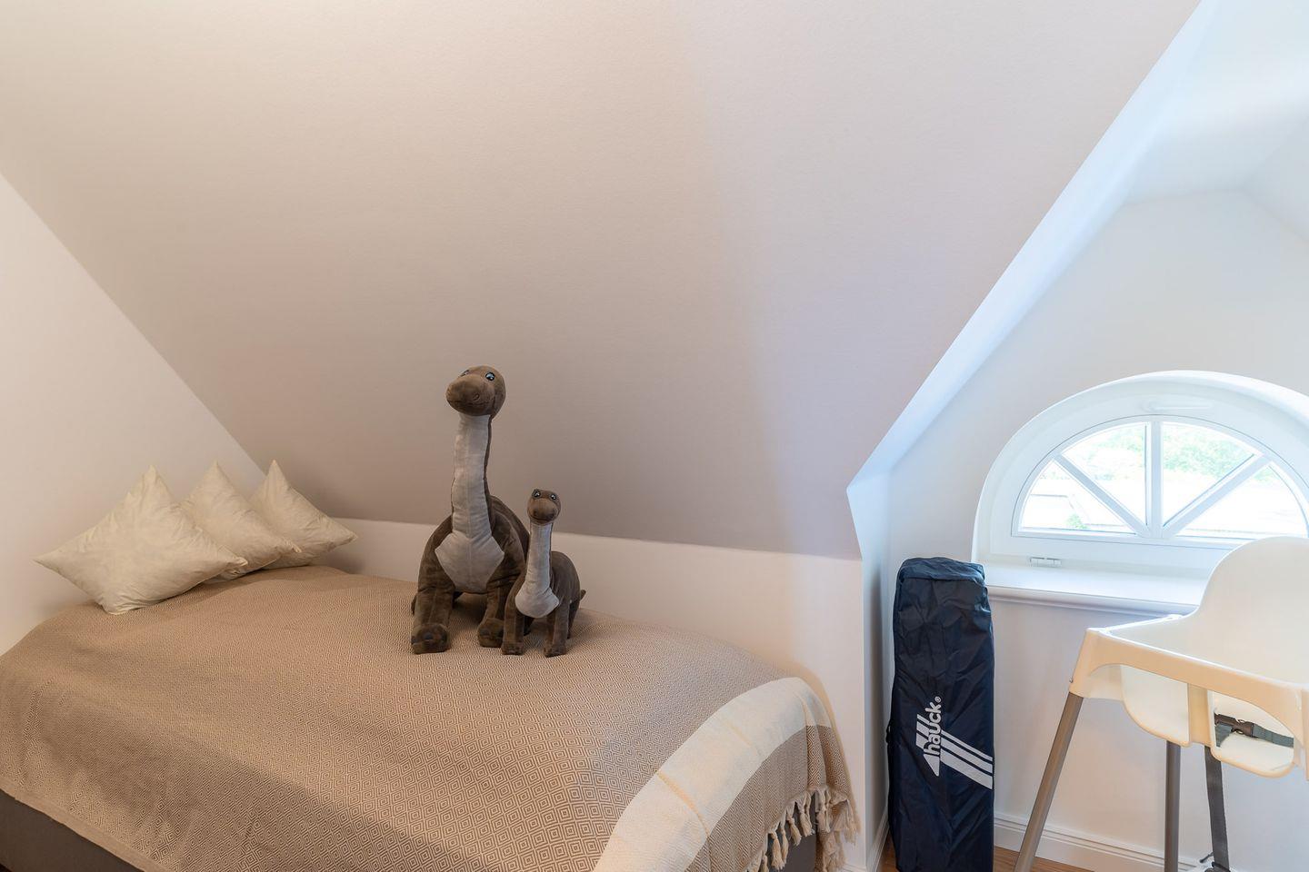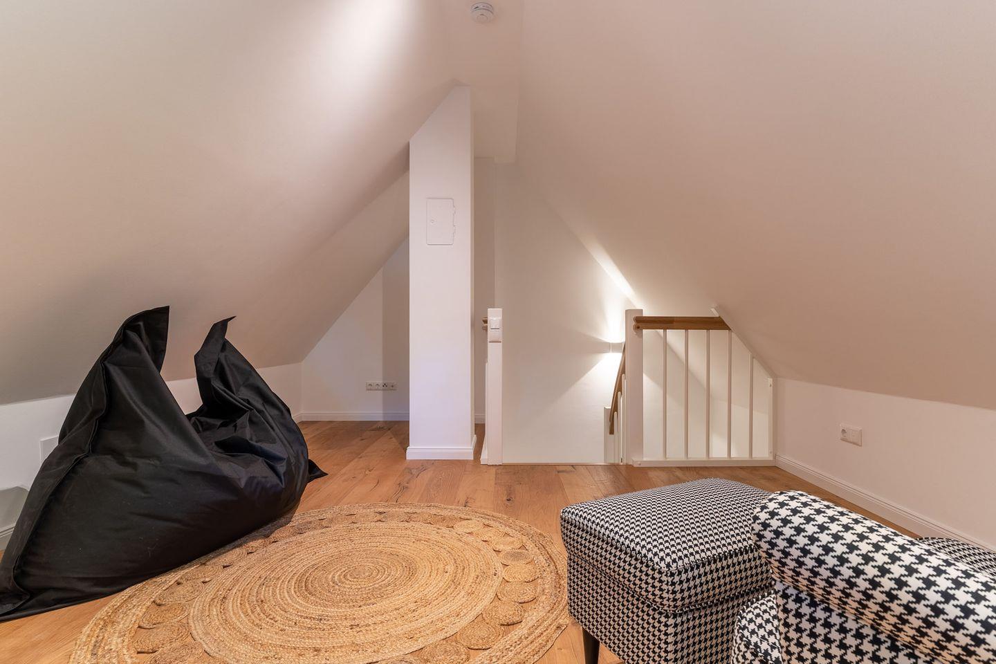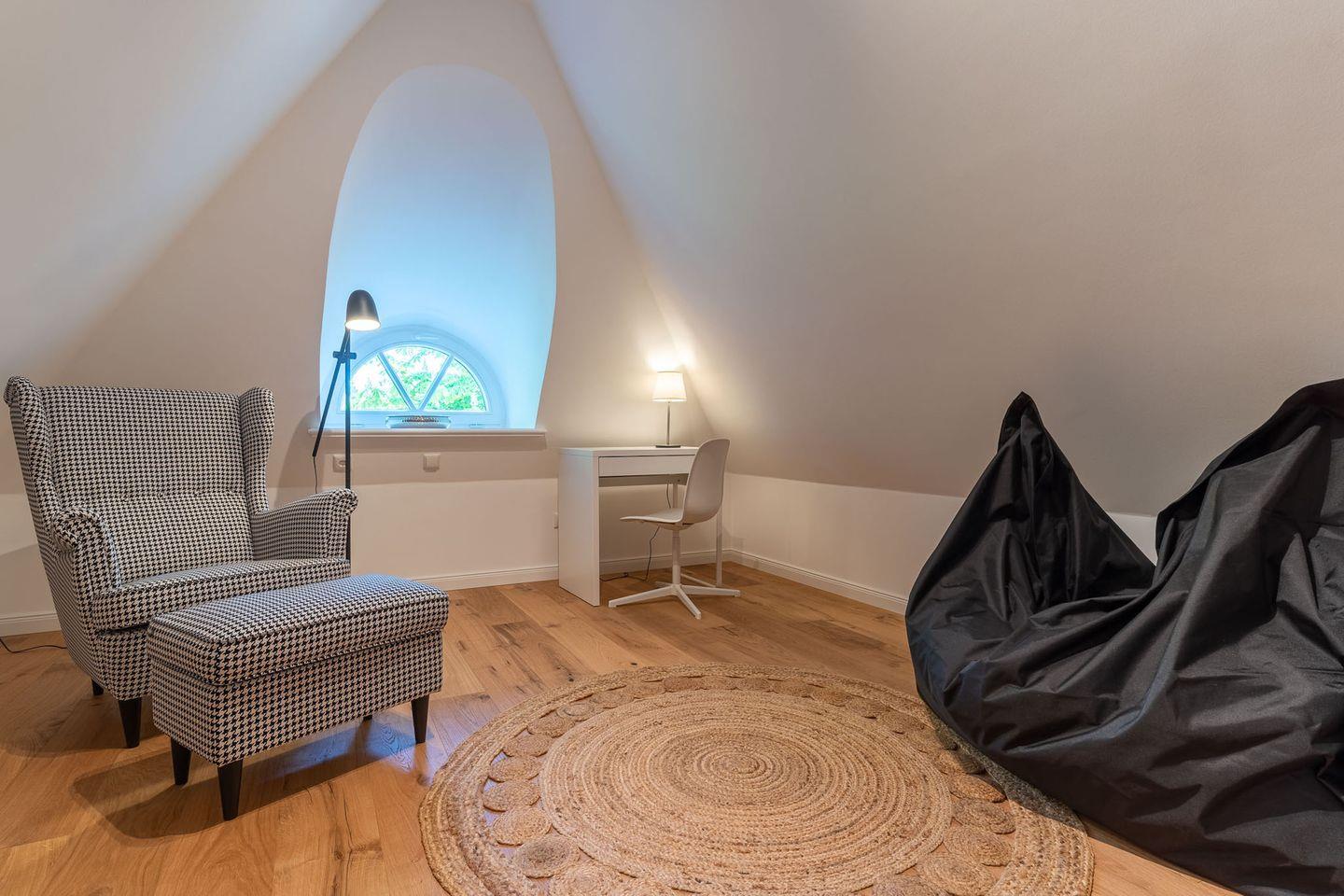 Im zweiten Obergeschoss mit Spitzboden finden Sie ein weiteres kleines Wohnzimmer mit ruhigem Arbeitsbereich und gemütlichem Lesesessel - der perfekte Rückzugsort zum ungestörten Arbeiten oder als Spielzimmer für Kinder.
