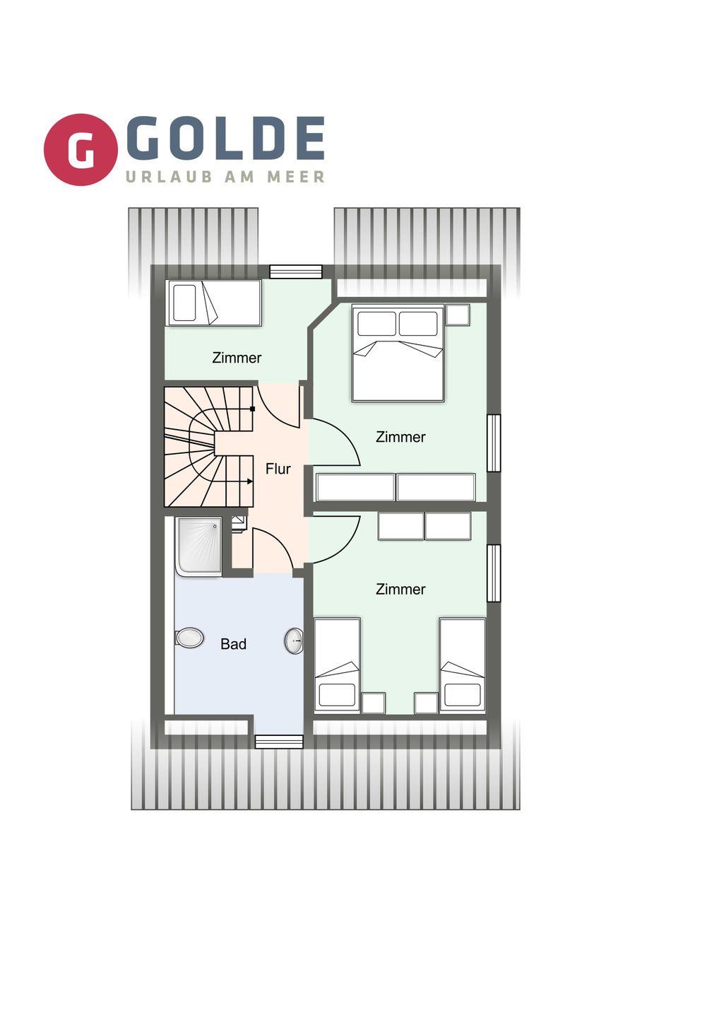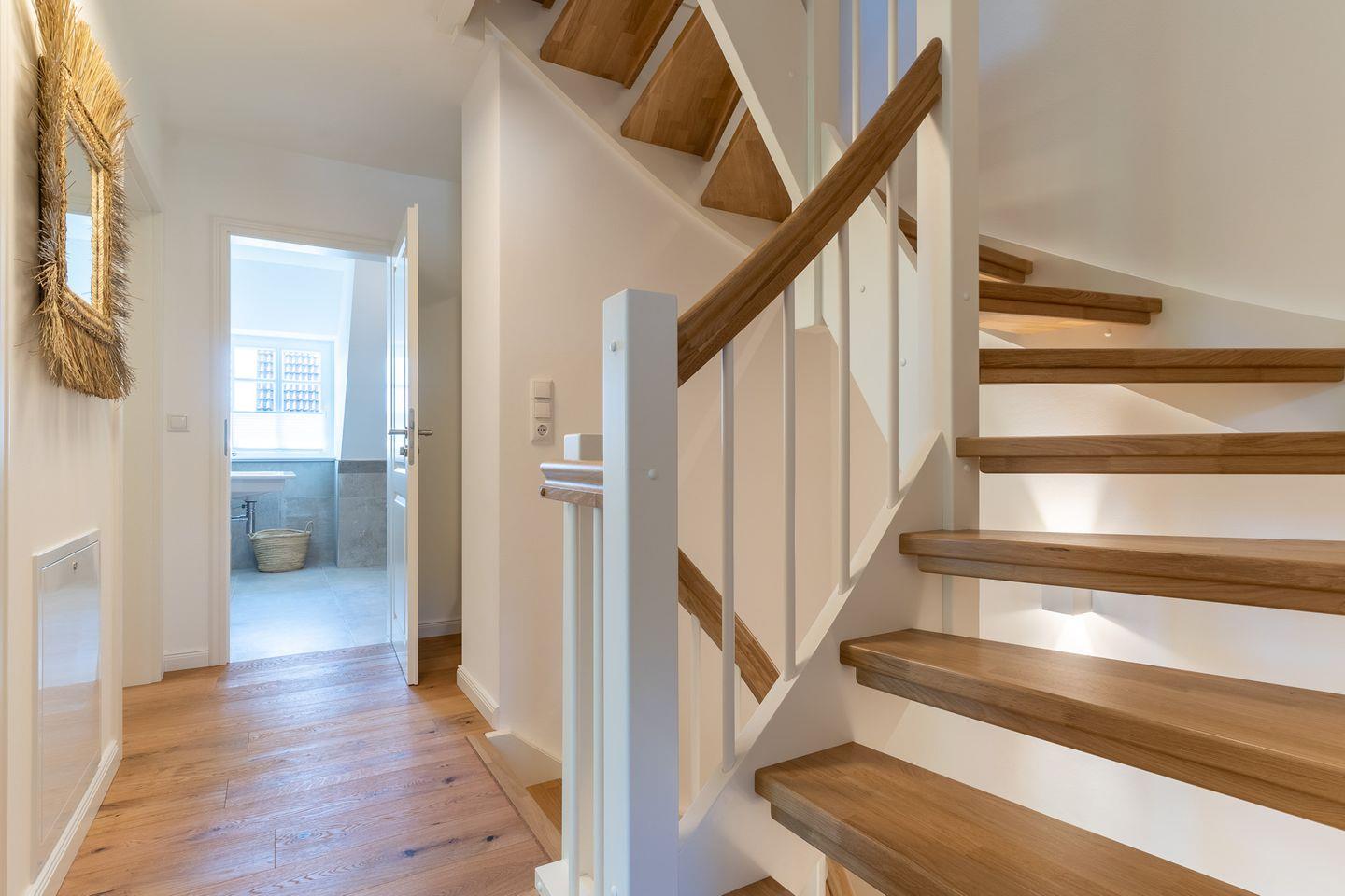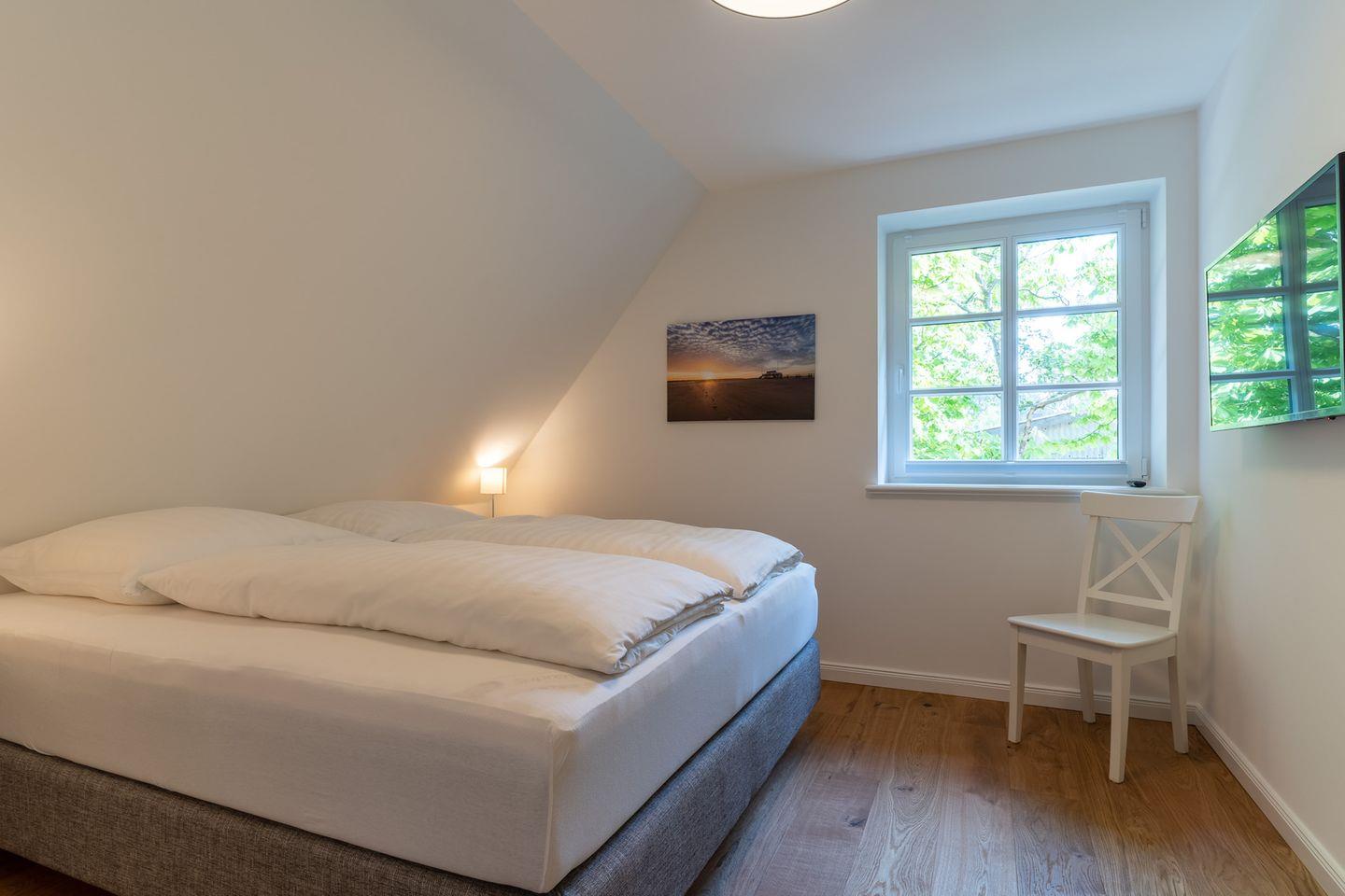 Im ersten Obergeschoss bieten zwei komfortabel ausgestattete Schlafzimmer ruhevolle Erholung. Ein Zimmer verfügt über ein Boxpring-Doppelbett mit TV, das andere über zwei Boxspring-Einzelbetten. Große Einbauschränke bieten ausreichend Ablagefläche. Für eine angenehme Auszeit sorgt das Badezimmer mit großer Wellness-Dusche und Kneippschlauch.