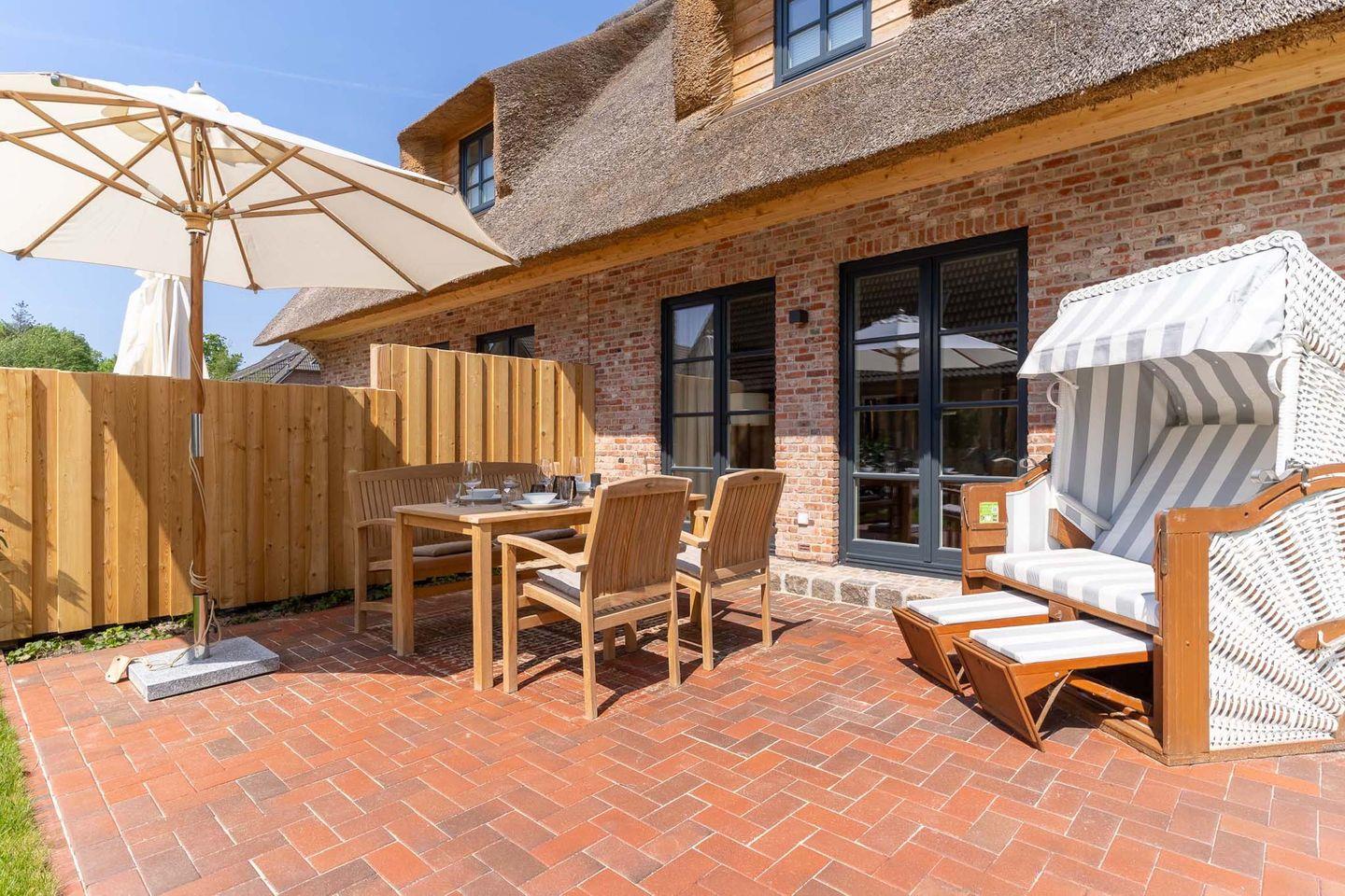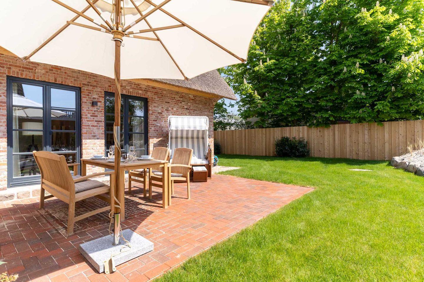 Der nach Süden ausgerichtete Garten mit großzügiger Terrasse, Rasenfläche, heimischen Pflanzen und Dünengras überzeugt mit hochwertigen Teak-Gartenmöbeln sowie einem gemütlichen Strandkorb. Für eine komfortable An- und Abreise steht Ihnen ein PKW-Stellplatz direkt am Haus zur Verfügung.