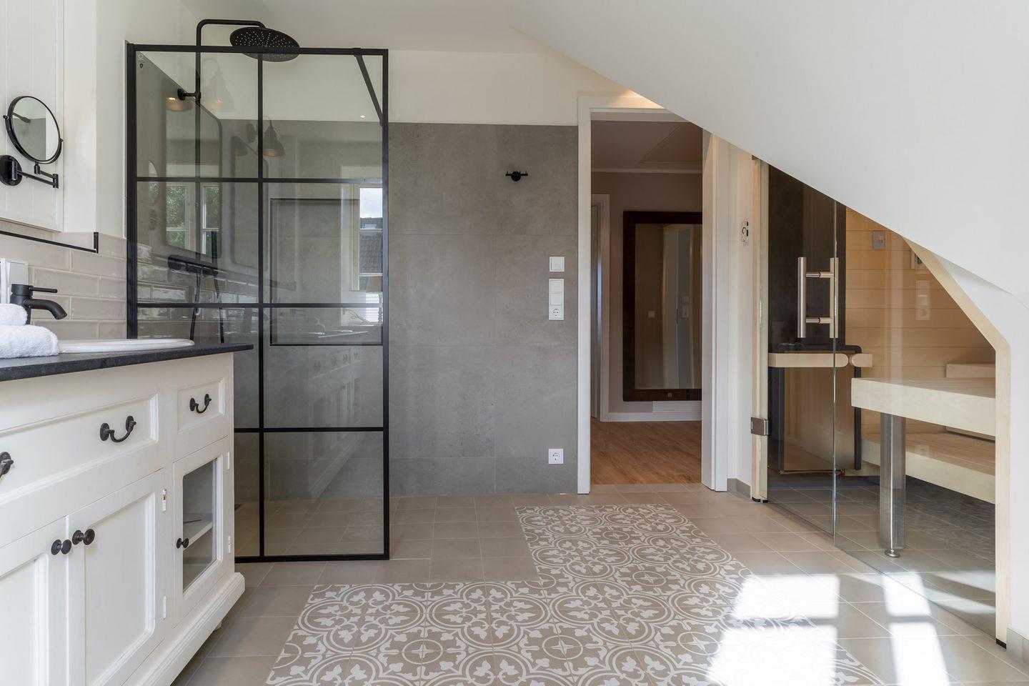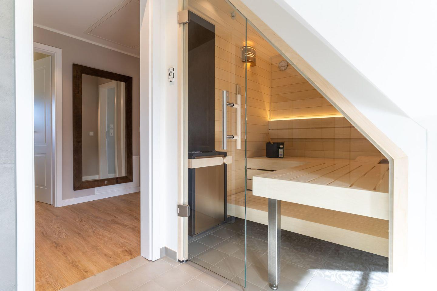 Das vollausgestattete Badezimmer im OG, hat eine Dusche, ein WC und einen großzügigen Doppelwaschtisch. Ein Highlight ist die integrierte Sauna, die das hochwertige Hauskonzept abrundet und keine Wünsche offen lässt.