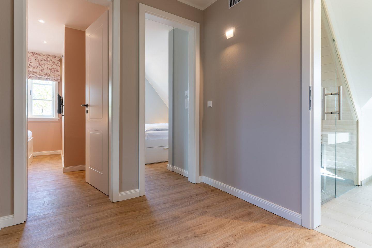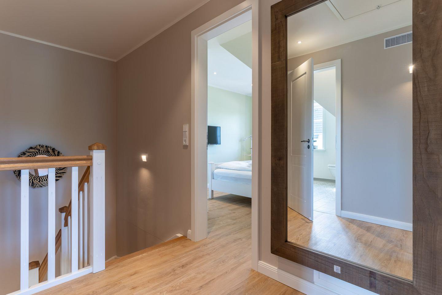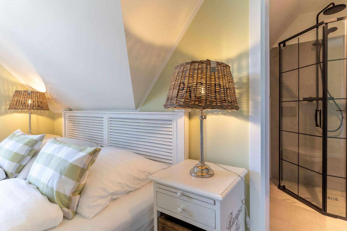 Über eine schöne Holztreppe gelangt man in das Obergeschoss, in dem sich 3 liebevoll eingerichtete Schlafzimmer sowie 2 Bäder mit einer kleinen Sauna befinden. Das Master-Schlafzimmer verfügt über ein Doppelbett, einen TV, einen großen Kleiderschrank sowie ein eigenes kleines Bad en suite. Die 2 anderen Schlafzimmer sind ebenfalls mit TV und einem Kleiderschrank ausgestattet.