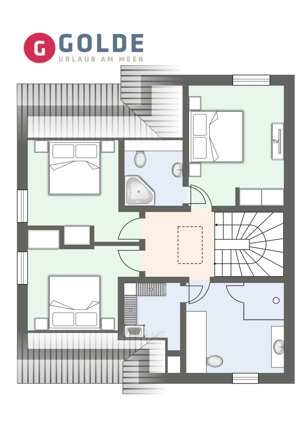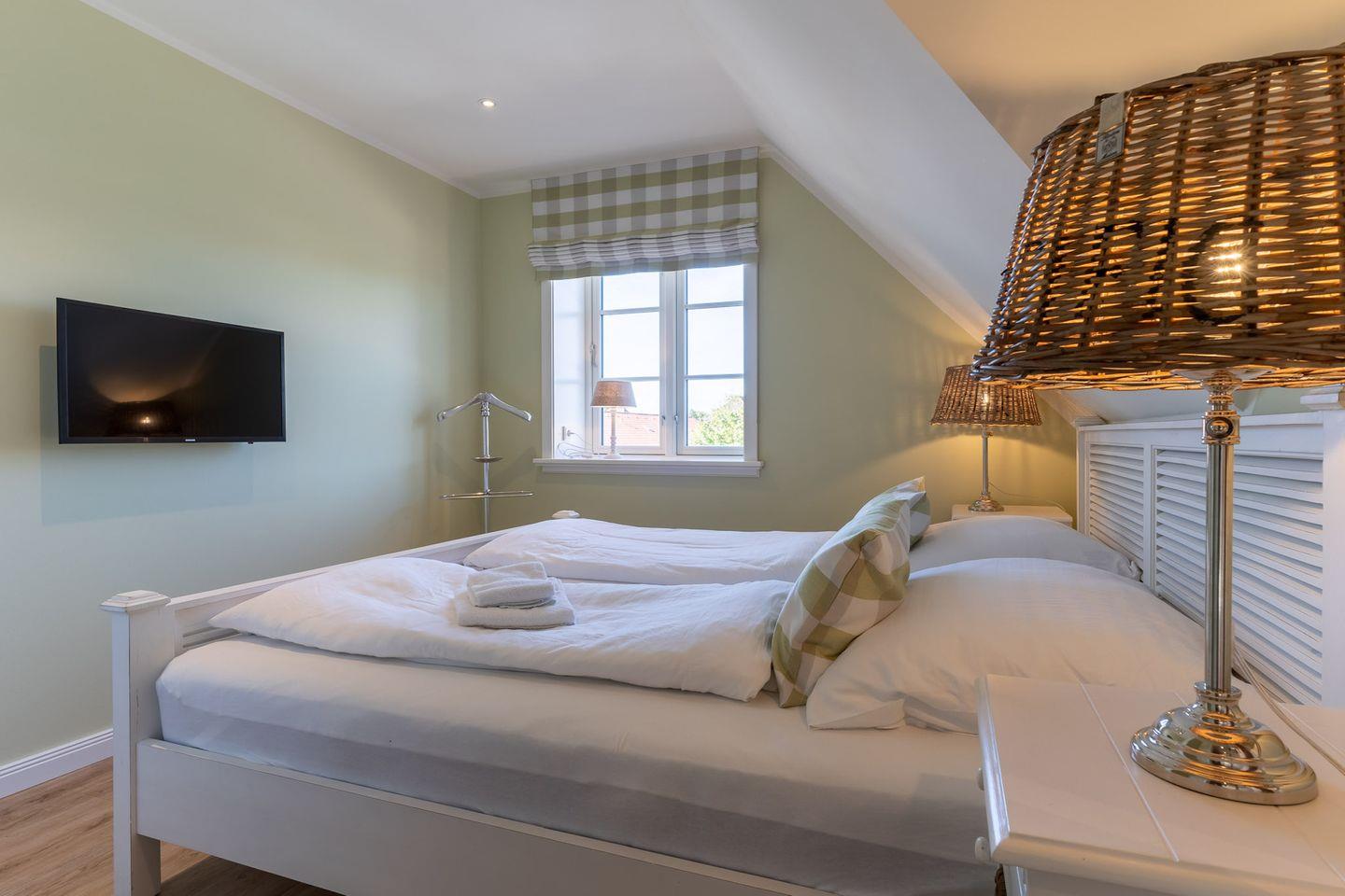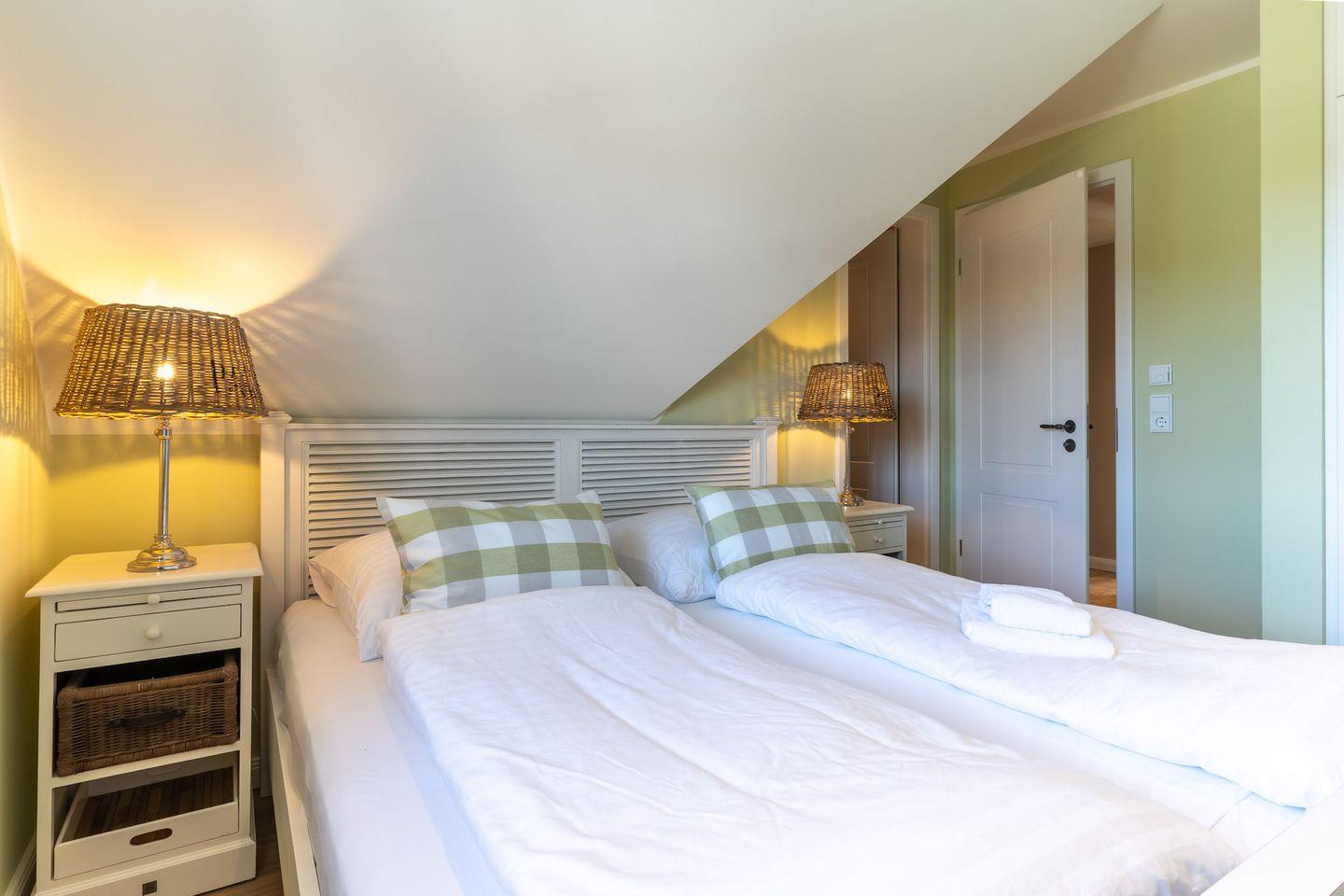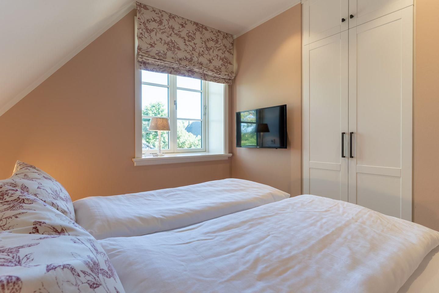 Über eine schöne Holztreppe gelangt man in das Obergeschoss, in dem sich 3 liebevoll eingerichtete Schlafzimmer sowie 2 Bäder mit einer kleinen Sauna befinden. Das Master-Schlafzimmer verfügt über ein Doppelbett, einen TV, einen großen Kleiderschrank sowie ein eigenes kleines Bad en suite. Die 2 anderen Schlafzimmer sind ebenfalls mit TV und einem Kleiderschrank ausgestattet.