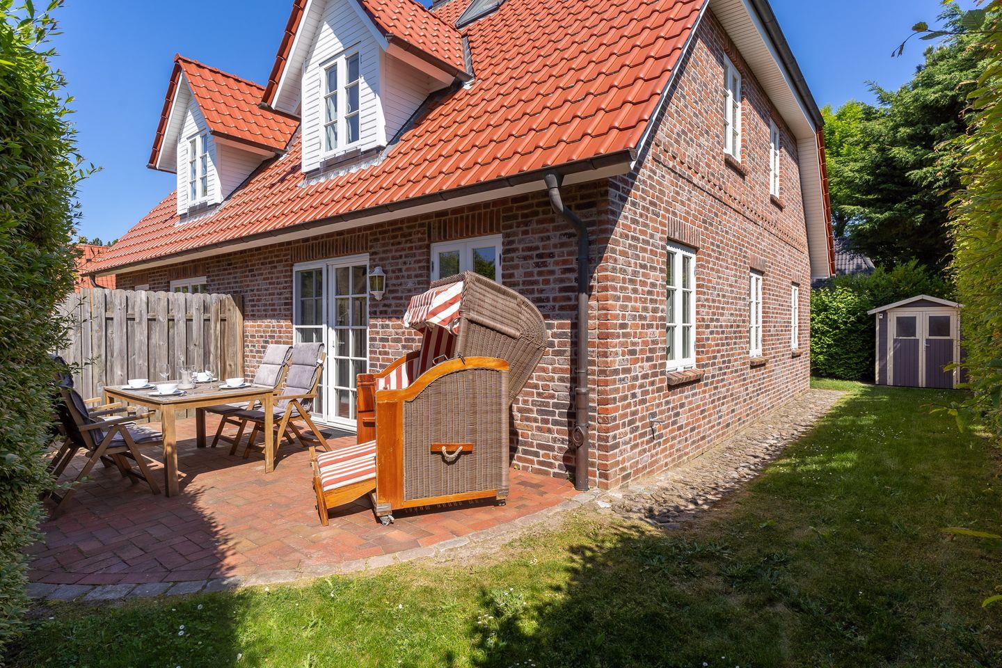 Das Grundstück mit Stellplatz, Gartenhaus für Ihre Fahrräder und einer sonnigen Terrasse ist mit heimischen Pflanzen und einer Düne angelegt.