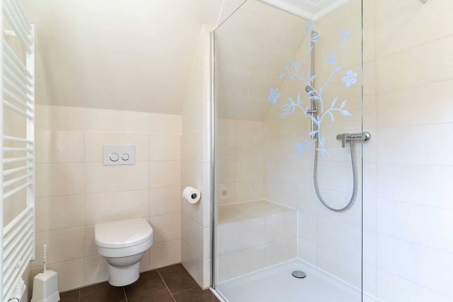 Über eine Treppe im Flur gelangen Sie in das erste Obergeschoss, wo Sie zwei komfortable Schlafzimmer erwarten. Das eine ist mit einem großen Doppelbett und einem Fernseher mit Netflix ausgestattet, während das andere mit zwei Einzelbetten für einen erholsamen Schlaf sorgt. Ein weiteres Duschbad mit WC komplettiert das Angebot auf dieser Ebene.