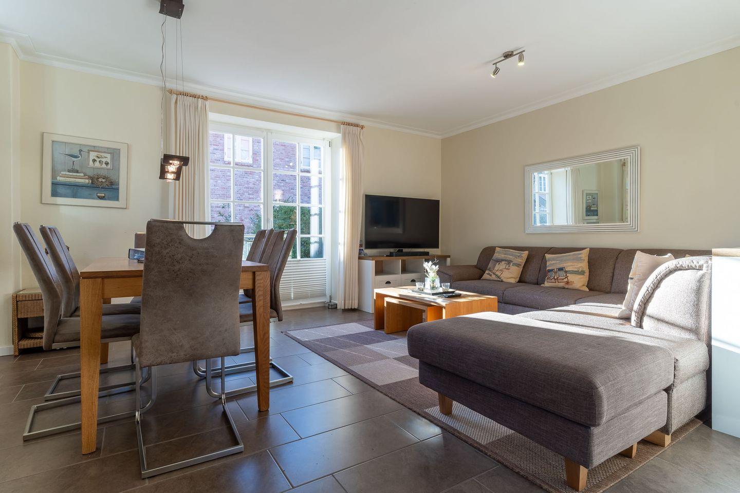 Herzlich willkommen in diesem liebevoll gestalteten Ferienhaus! Auf insgesamt drei Ebenen erstreckt sich eine großzügige Wohnfläche von etwa 95qm, die mit einer durchdachten Raumaufteilung besticht. Der Wohnraum im Erdgeschoss überzeugt mit bodentiefen Fenstern, die für viel Licht und einen wunderschönen Blick in den Garten sorgen. Eine moderne und voll ausgestattete Küche, ein gemütlicher Essbereich und ein bequemes Sofa runden das Angebot ab. Hier können Sie entspannt Ihre Mahlzeiten genießen oder gemeinsam den Abend ausklingen lassen.