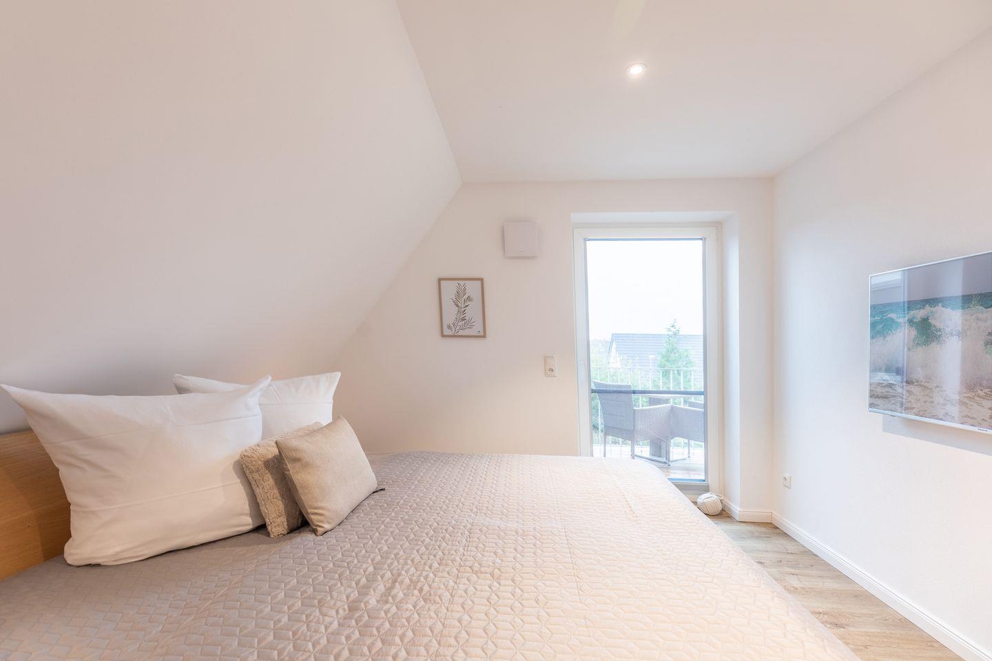 Nach einem ereignisreichen Urlaubstag finden Sie Erholung in einem Schlafzimmer mit Doppelbett (200 × 200 cm, getrennte Matratzen) sowie einem weiteren Fernseher. In einem großen Kleiderschrank können Sie bequem Ihre Sachen verstauen. Auch von hier aus haben Sie Zugang zum schönen Balkon.
