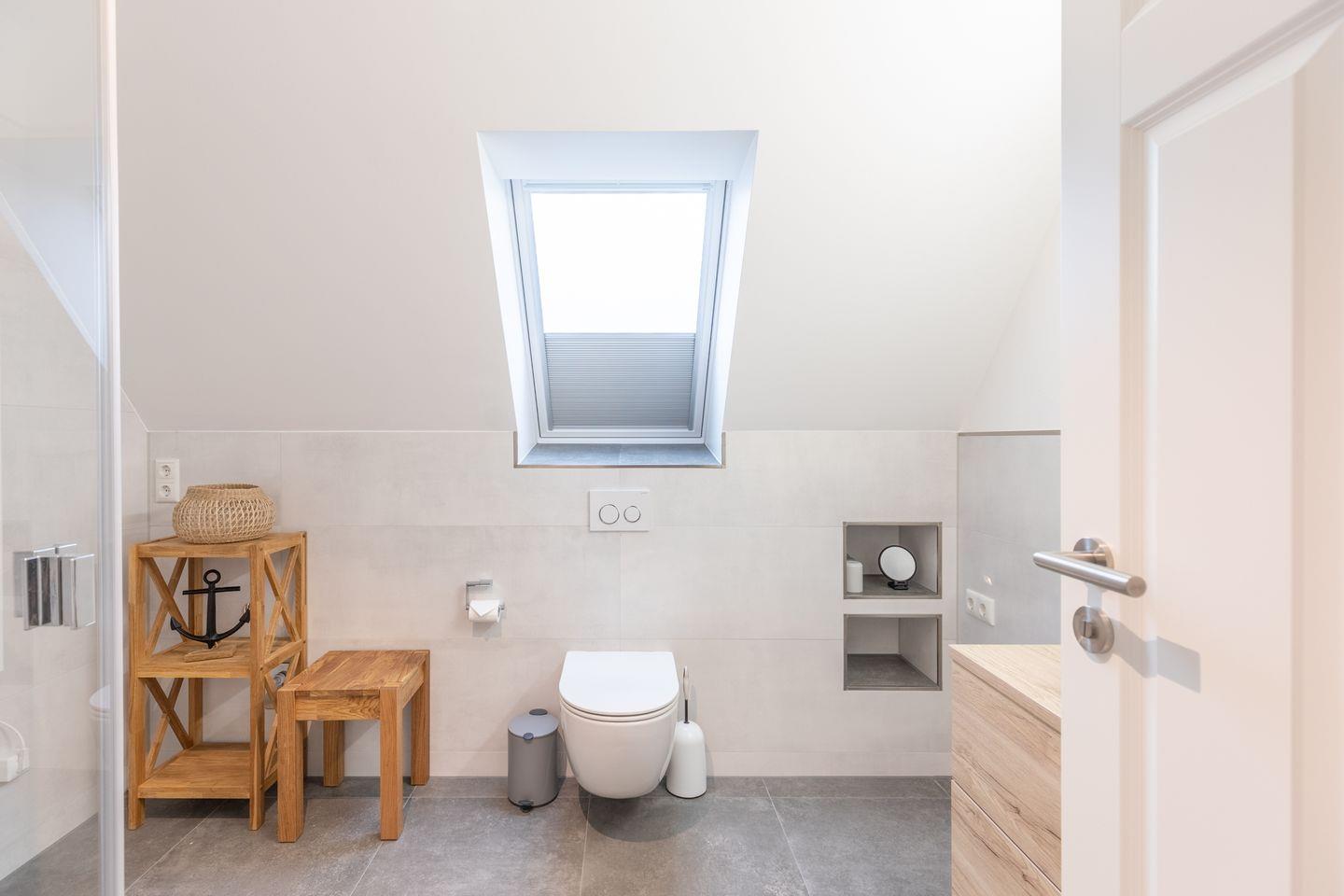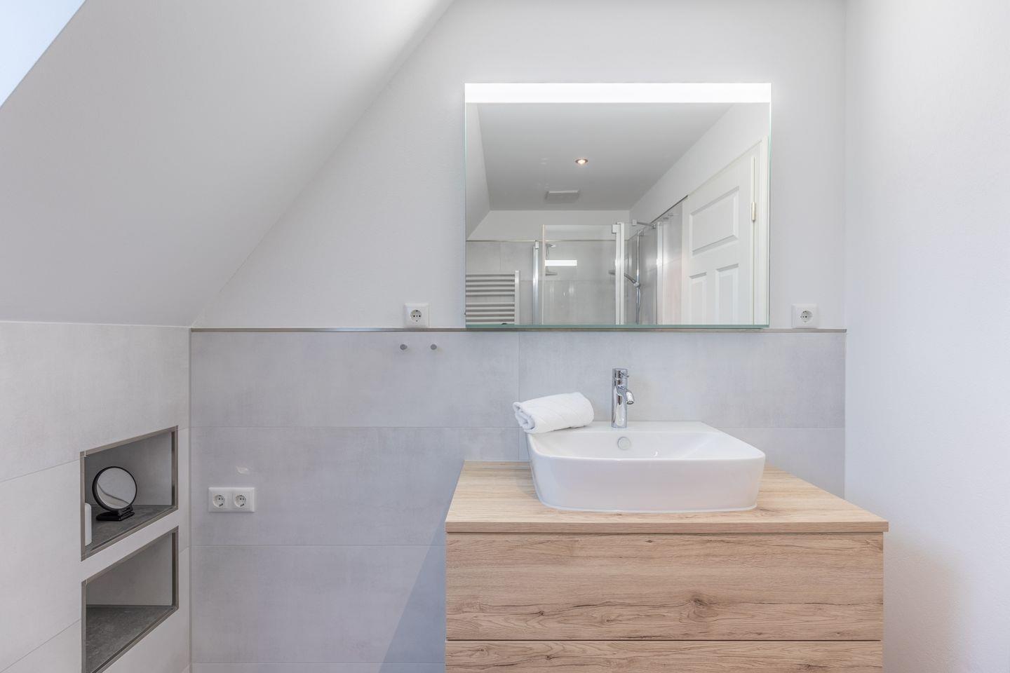 Die Ferienwohnung verfügt des Weiteren über ein modernes Badezimmer mit Fenster, ebenerdiger Dusche, Handtuchheizung, Waschbecken und WC.