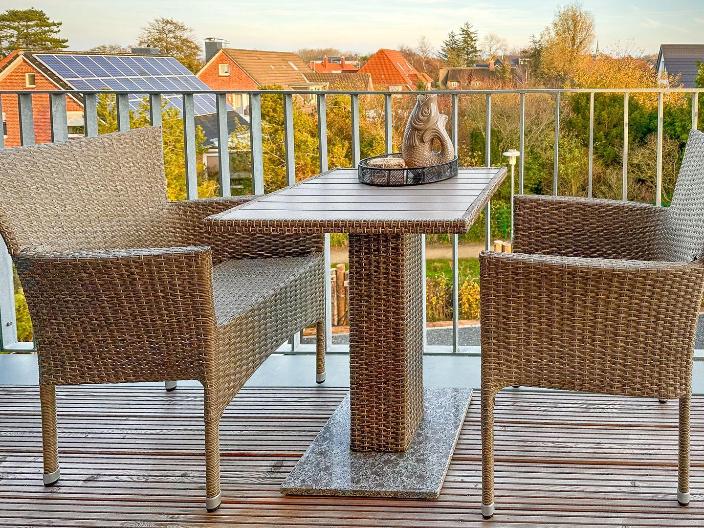 Über den Wohnbereich erreichen Sie den möblierten Ost-Balkon, auf dem sich hoch oben bei fantastischem Ausblick zahlreiche Sonnenstunden genießen lassen.