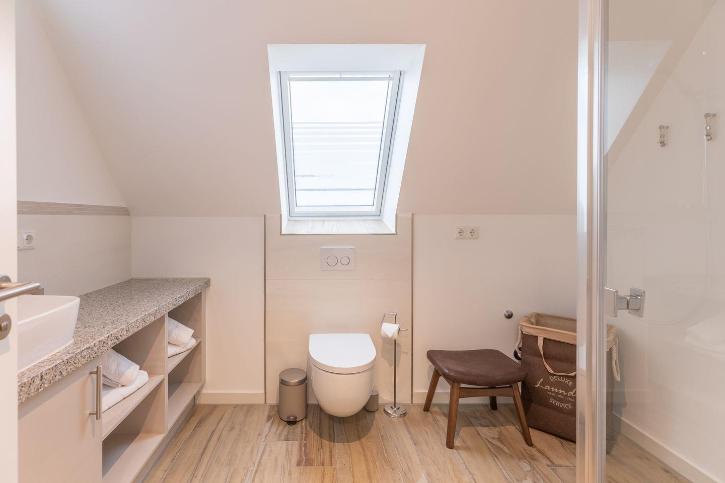 Das moderne Bad mit Fenster hat eine ebenerdige Dusche zu bieten. Waschmaschine und Trockner stehen Ihnen zur freien Verfügung im Flur 2. OG (…Tür neben der Treppe und der Klingel Moand).