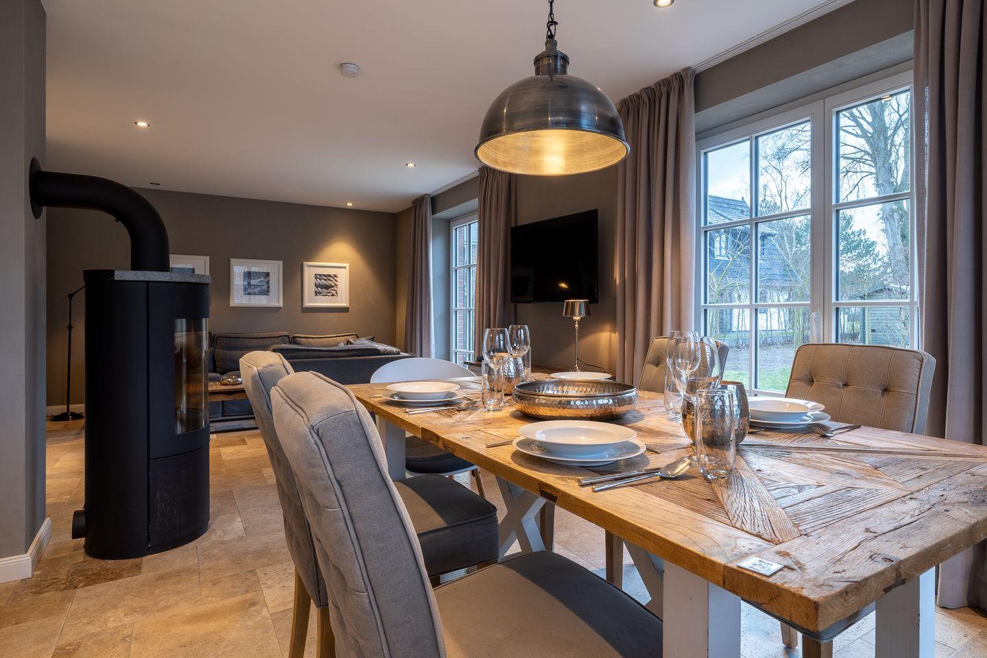 Die luxuriöse Haushälfte Dorfremise verfügt über ca. 120 m² Wohnfläche und bietet Platz für 6 Personen. Im Erdgeschoss befindet sich der lichtdurchflutete Wohnraum mit TV, Kamin, einer offener Küche sowie einem stilvollen Essbereich. Die Wohn- und Schlafräume sind mit exklusiven Möbeln von Riviera Maison ausgestattet. Die Küche verfügt über hochwertige Elektrogeräte. An den Wohnbereich schließen sich ein Flur mit eingebauter Garderobe, ein Hauswirtschaftsraum und ein mit edlem Sandstein gefliestes Duschbad an. Das Erdgeschoss verfügt über einen geschmackvollen Natursteinfußboden, der über eine Fußbodenheizung beheizt werden kann.