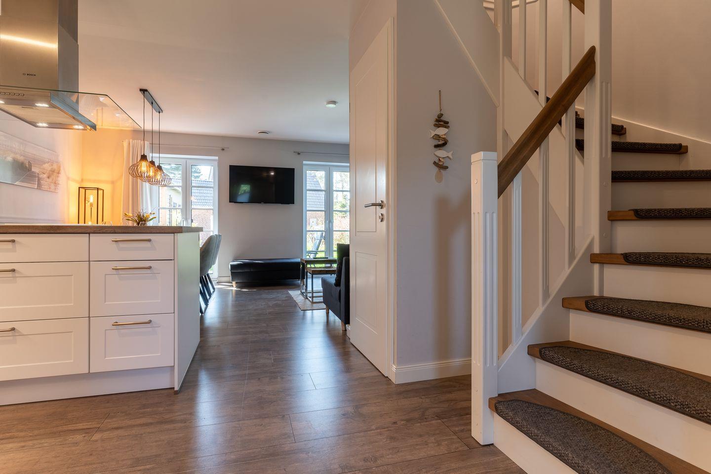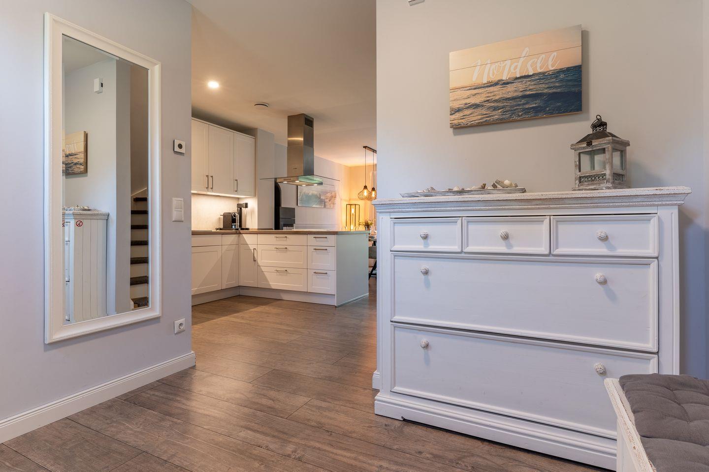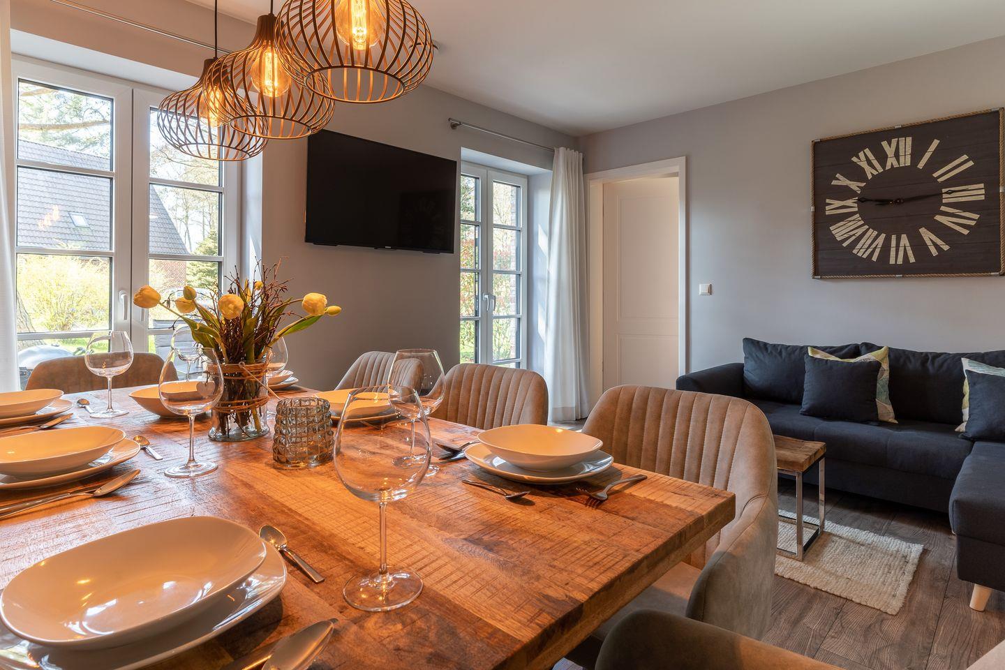 Die luxuriöse Haushälfte verfügt über ca. 130 m² Wohnfläche und bietet großzügigen Platz für 8 Personen. Im Erdgeschoss befindet sich der moderne Wohnbereich mit TV, Kamin, einer offenen Küche sowie einem stilvollen Essbereich. Die Wohnräume sind mit exklusiven Möbeln ausgestattet. Die Küche verfügt über hochwertige Elektrogeräte. An den Wohnbereich schließen sich ein Flur mit eingebauter Garderobe, ein Abstellraum und ein Gästebad an. Das gesamte Erdgeschoss ist mit geschmackvollen Fußbodenbelegen versehen, die über eine Fußbodenheizung beheizt werden können.
