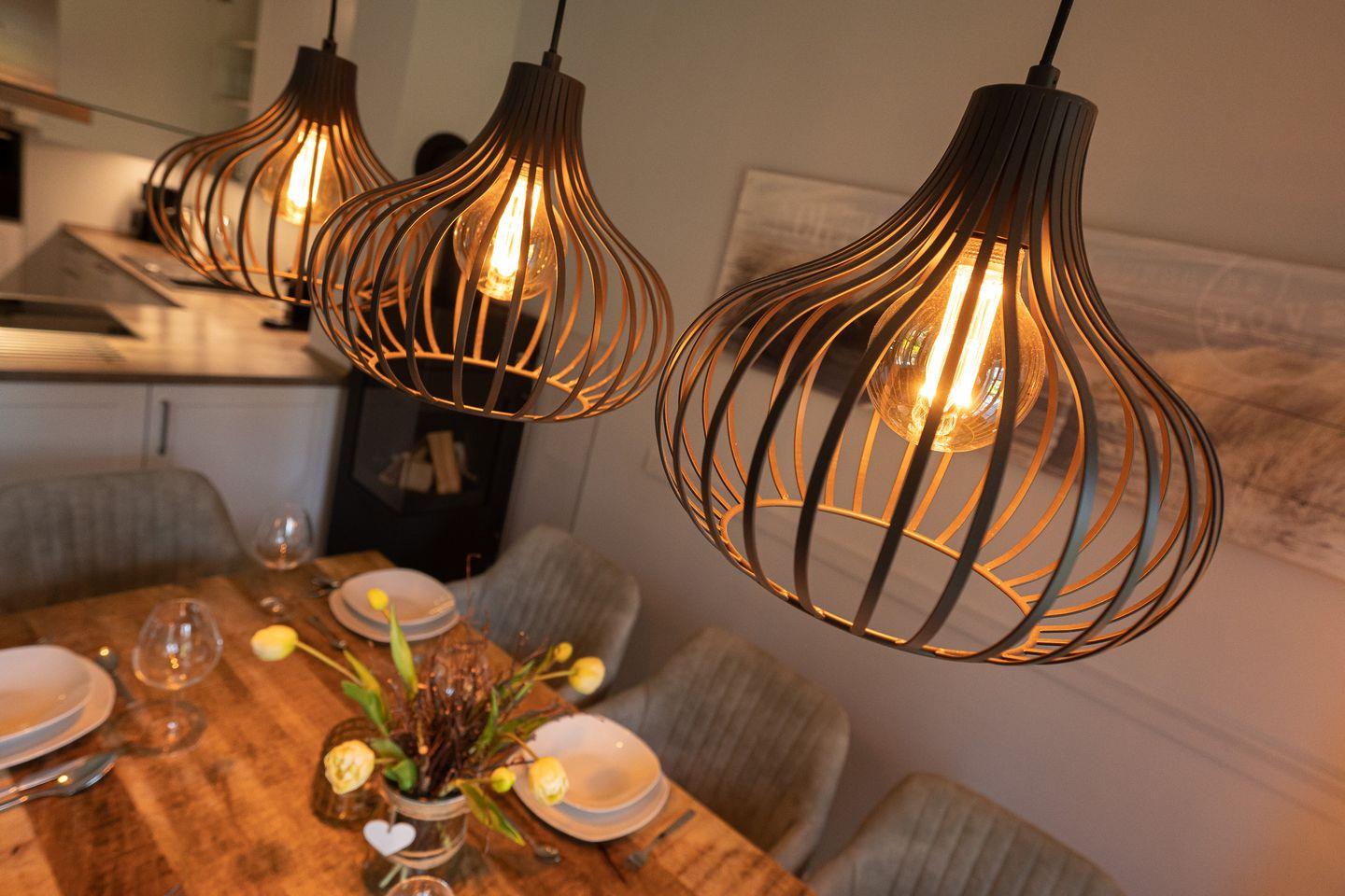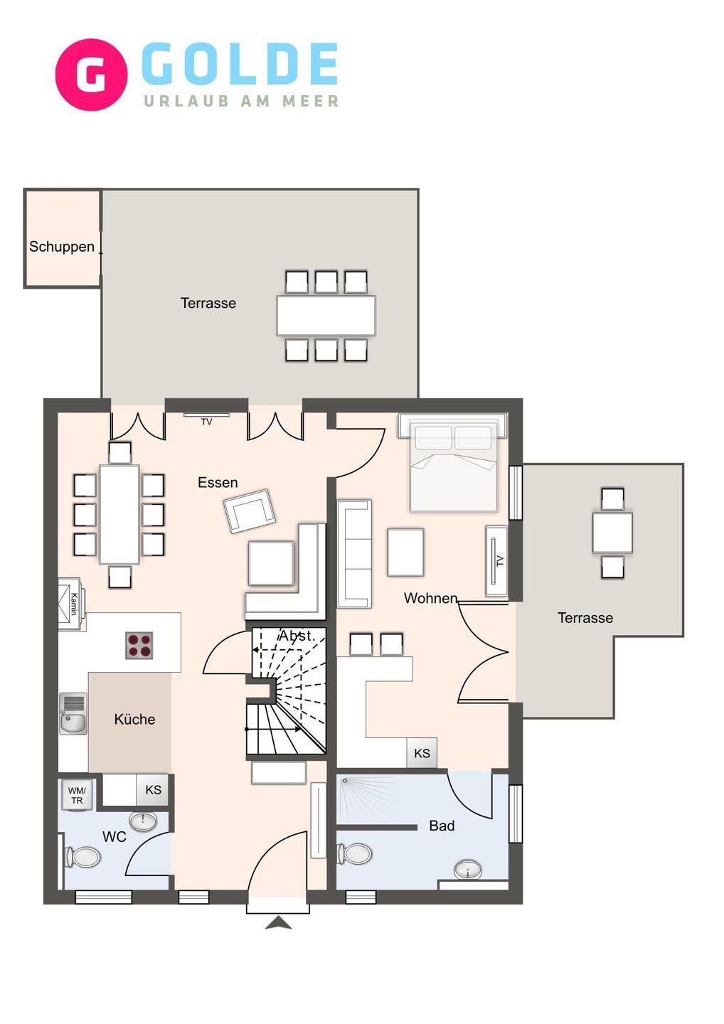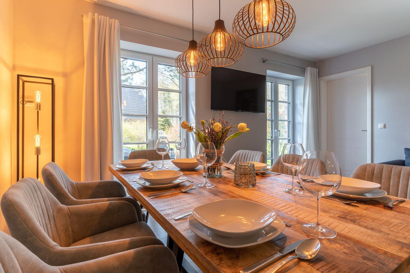 Die luxuriöse Haushälfte verfügt über ca. 130 m² Wohnfläche und bietet großzügigen Platz für 8 Personen. Im Erdgeschoss befindet sich der moderne Wohnbereich mit TV, Kamin, einer offenen Küche sowie einem stilvollen Essbereich. Die Wohnräume sind mit exklusiven Möbeln ausgestattet. Die Küche verfügt über hochwertige Elektrogeräte. An den Wohnbereich schließen sich ein Flur mit eingebauter Garderobe, ein Abstellraum und ein Gästebad an. Das gesamte Erdgeschoss ist mit geschmackvollen Fußbodenbelegen versehen, die über eine Fußbodenheizung beheizt werden können.