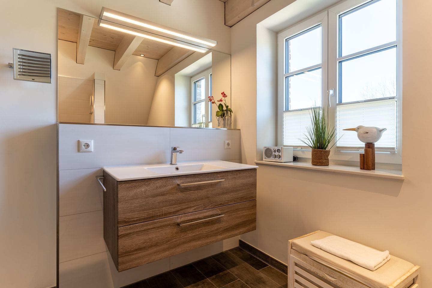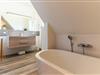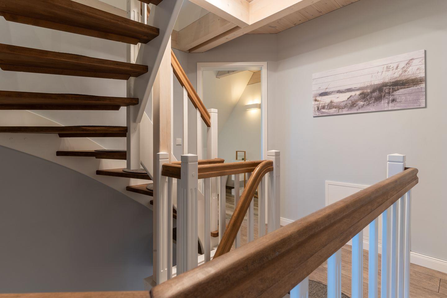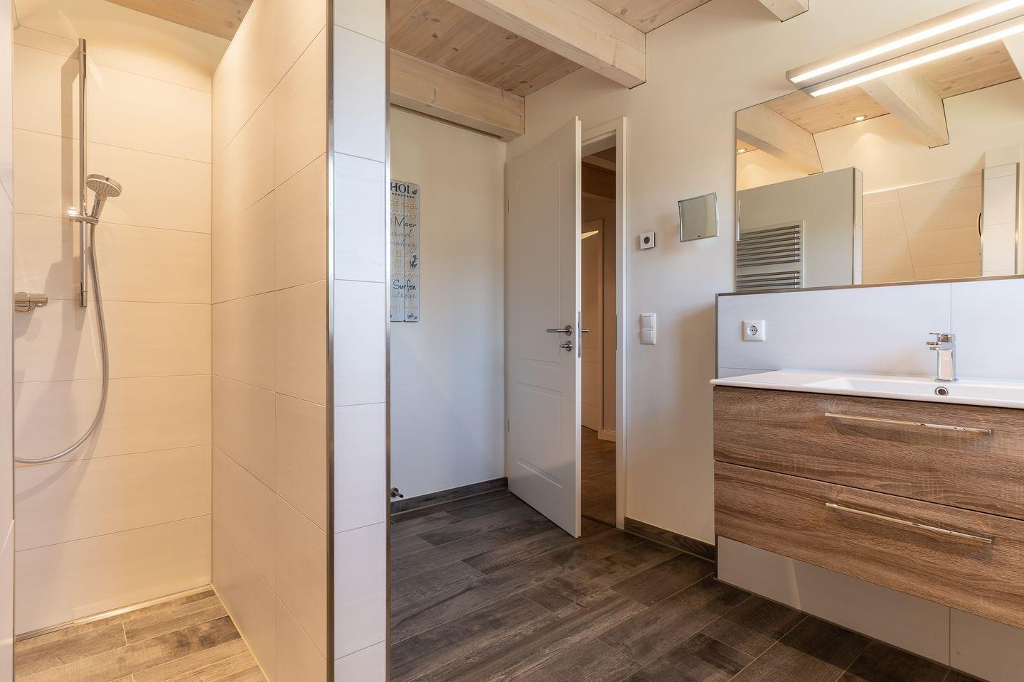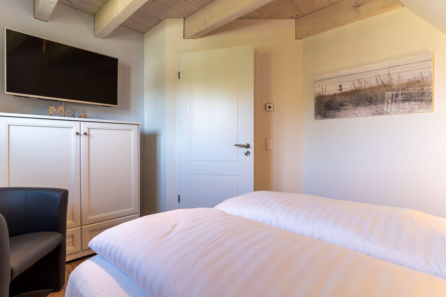 Über eine Holztreppe gelangt man in das Obergeschoss mit offener Holzdecke. Die beiden Schlafzimmer, jeweils mit einem Doppelbett, sind ebenfalls mit TV ausgestattet. Kleiderschränke gewähren Ihnen hinreichend Ablageflächen. Darüber hinaus befinden sich im Obergeschoss zwei weitere, geräumige Bäder jeweils mit großer Dusche. Für zusätzliche Entspannung sorgt eine Sauna, sowie eine freistehende Badewanne.