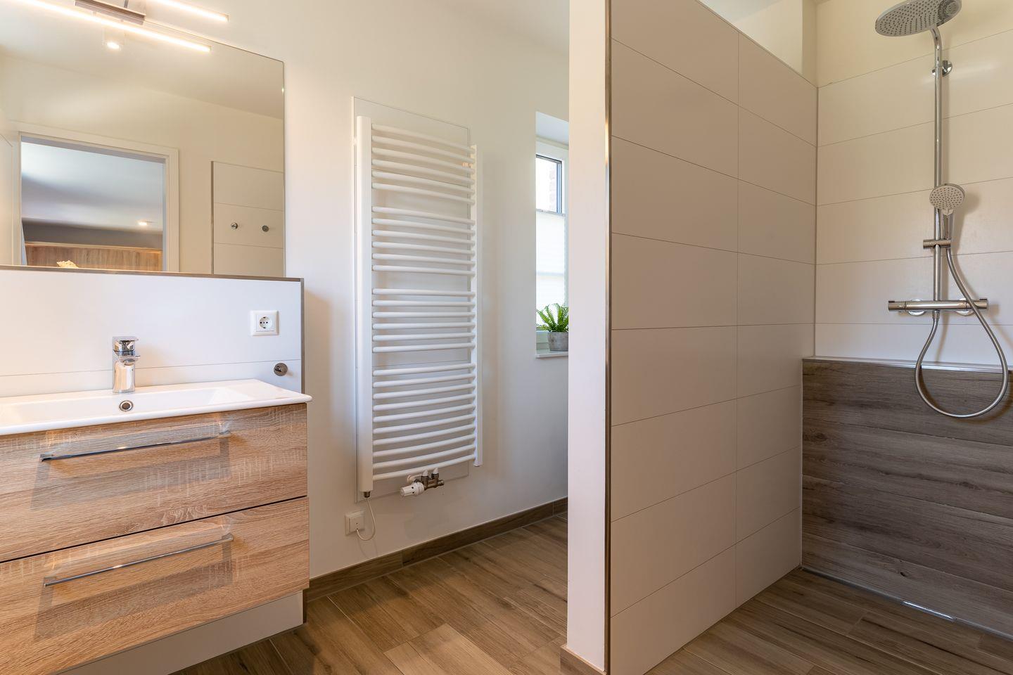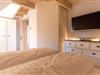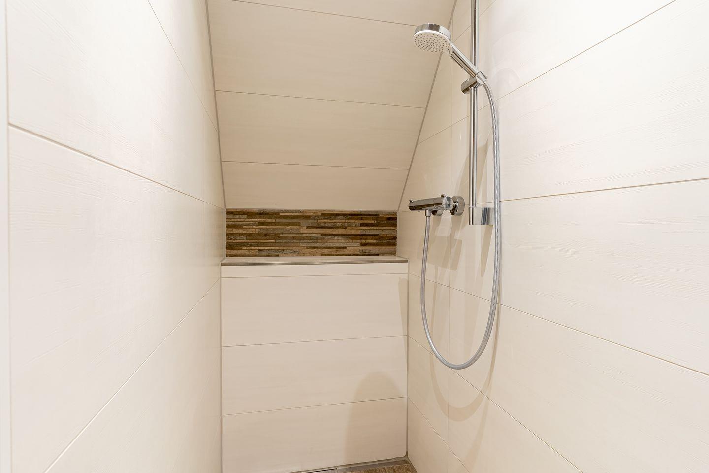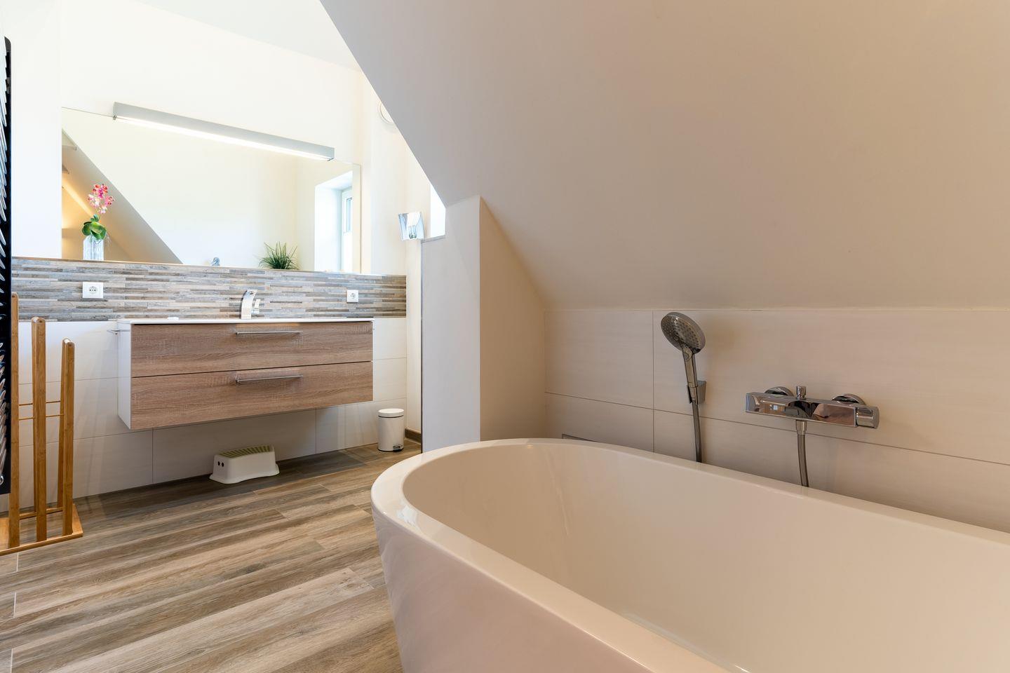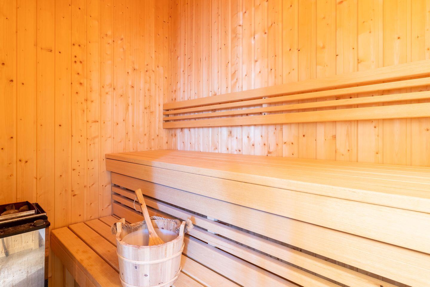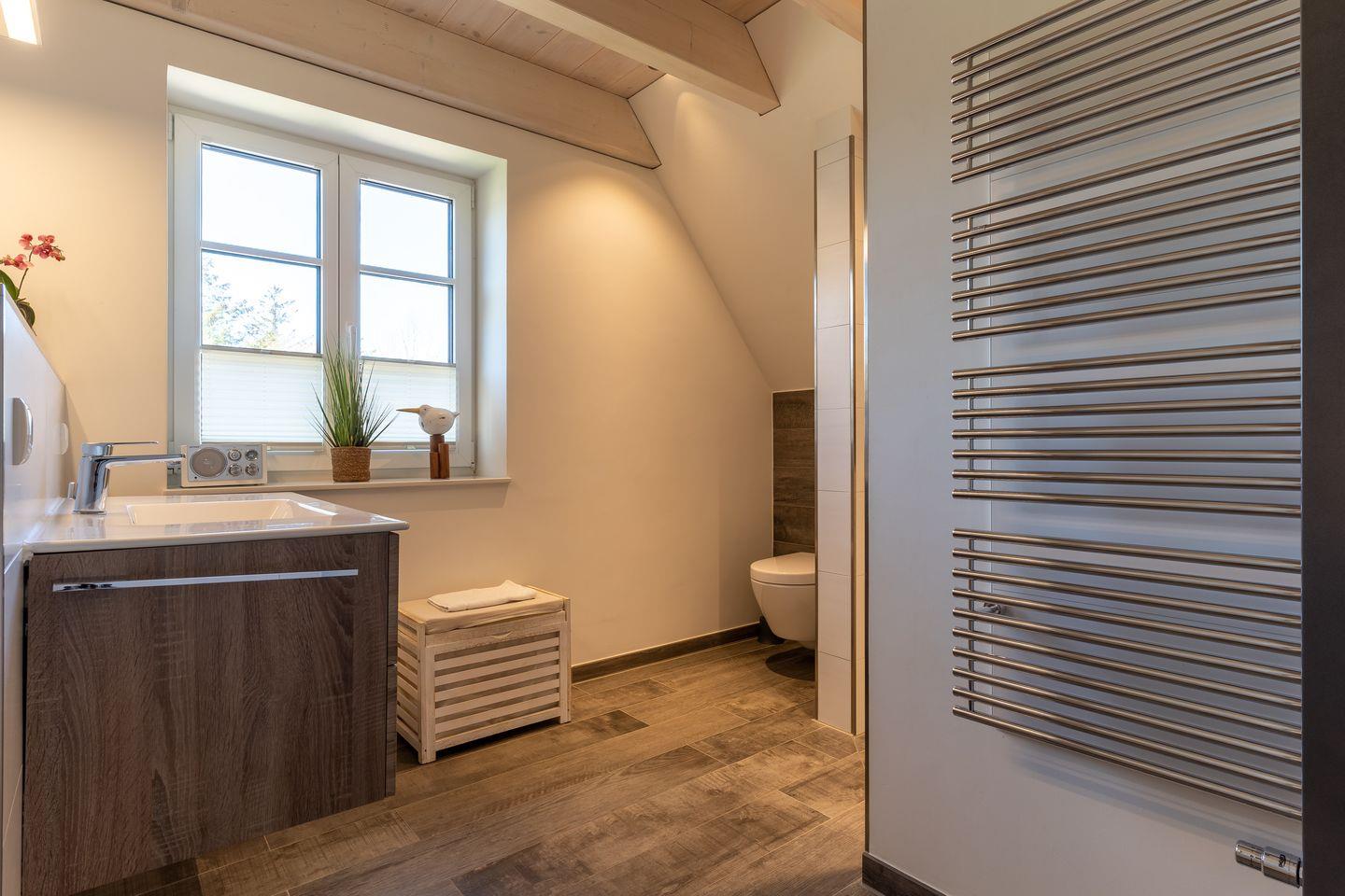Über eine Holztreppe gelangt man in das Obergeschoss mit offener Holzdecke. Die beiden Schlafzimmer, jeweils mit einem Doppelbett, sind ebenfalls mit TV ausgestattet. Kleiderschränke gewähren Ihnen hinreichend Ablageflächen. Darüber hinaus befinden sich im Obergeschoss zwei weitere, geräumige Bäder jeweils mit großer Dusche. Für zusätzliche Entspannung sorgt eine Sauna, sowie eine freistehende Badewanne.