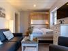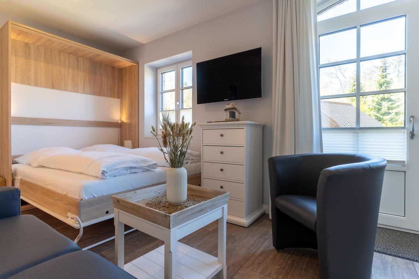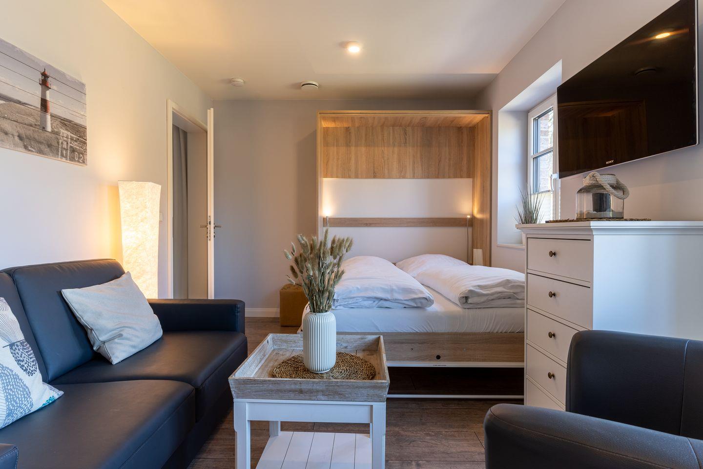 Ein Highlight!!! Zusätzlich gibt es mit einer Verbindungstür vom Wohnzimmer ein weiteren Wohnbereich für 2 Personen. Hier ist ein gemütliches Wohnzimmer mit großer Fensterfront, ein hochwertiges und komfortables Schrankbett und eine offene Küchen mit Tresen. Außerdem rundet ein weiteres Duschbad jeden Komfort ab.