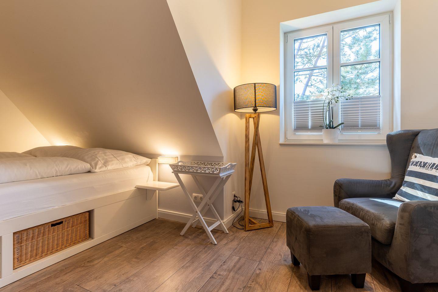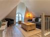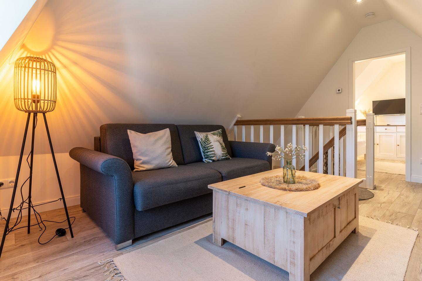 Vom Obergeschoss führt die Holztreppe hinauf in das Dachgeschoss. Ein drittes Schlafzimmer mit 2 Einzelbetten, Schlafsofa mit 2 weiteren Schlafplätzen und urigen Fenstern erfüllt jeden Urlaubstraum.