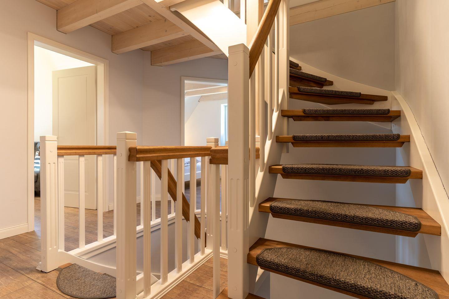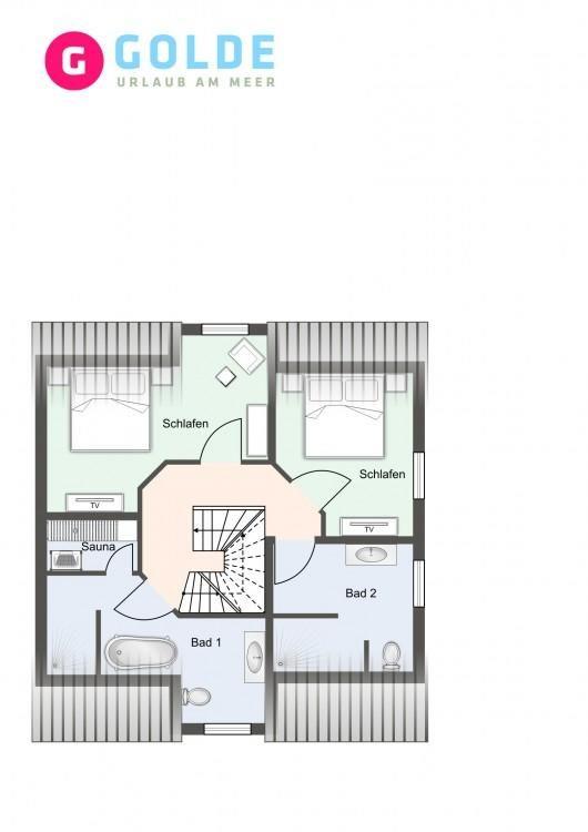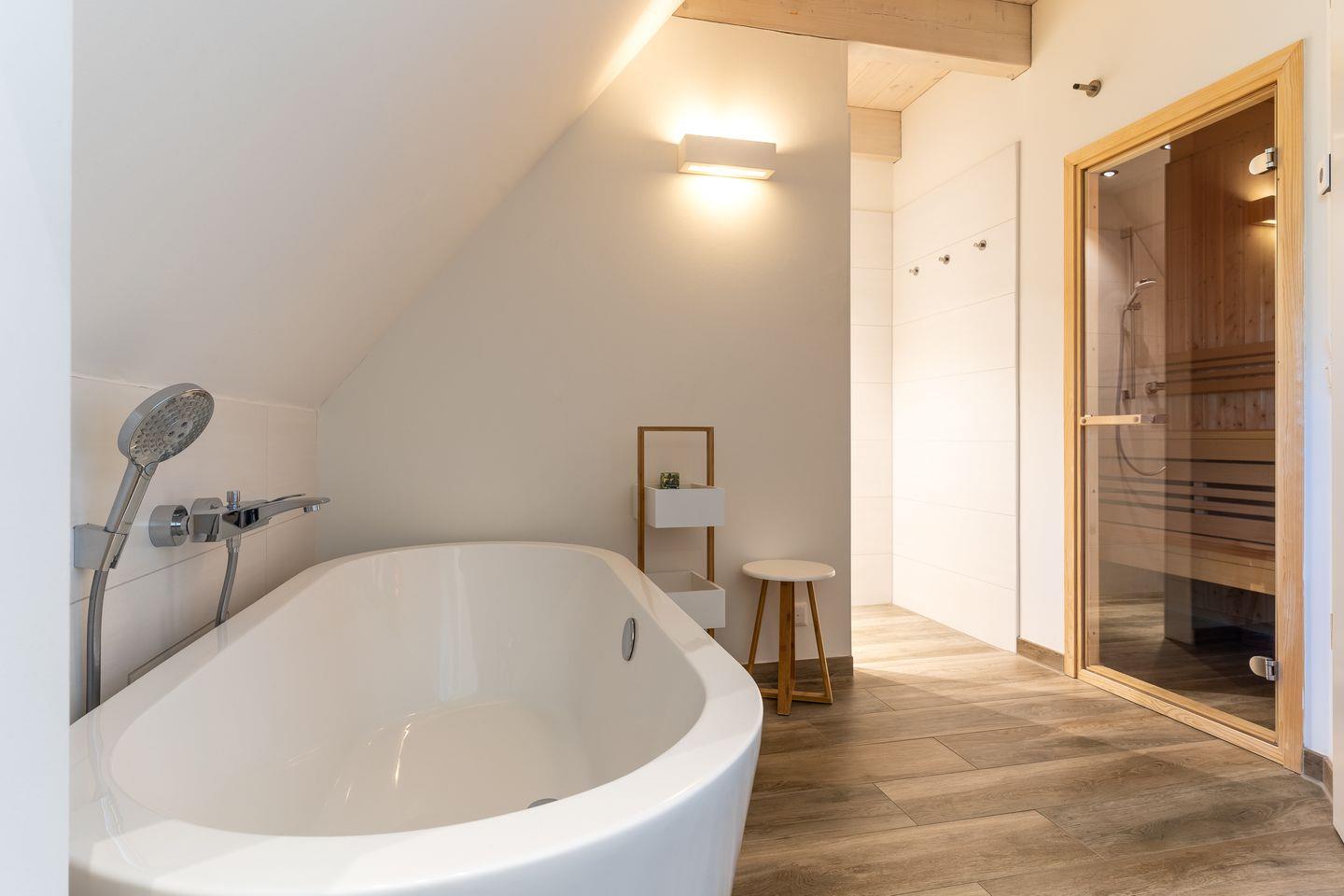 Über eine Holztreppe gelangt man in das Obergeschoss mit offener Holzdecke. Die beiden Schlafzimmer, jeweils mit einem Doppelbett, sind ebenfalls mit TV ausgestattet. Kleiderschränke gewähren Ihnen hinreichend Ablageflächen. Darüber hinaus befinden sich im Obergeschoss zwei weitere, geräumige Bäder jeweils mit großer Dusche. Für zusätzliche Entspannung sorgt eine Sauna, sowie eine freistehende Badewanne.