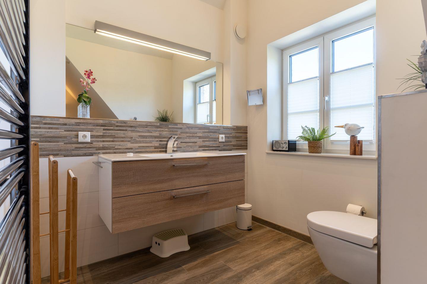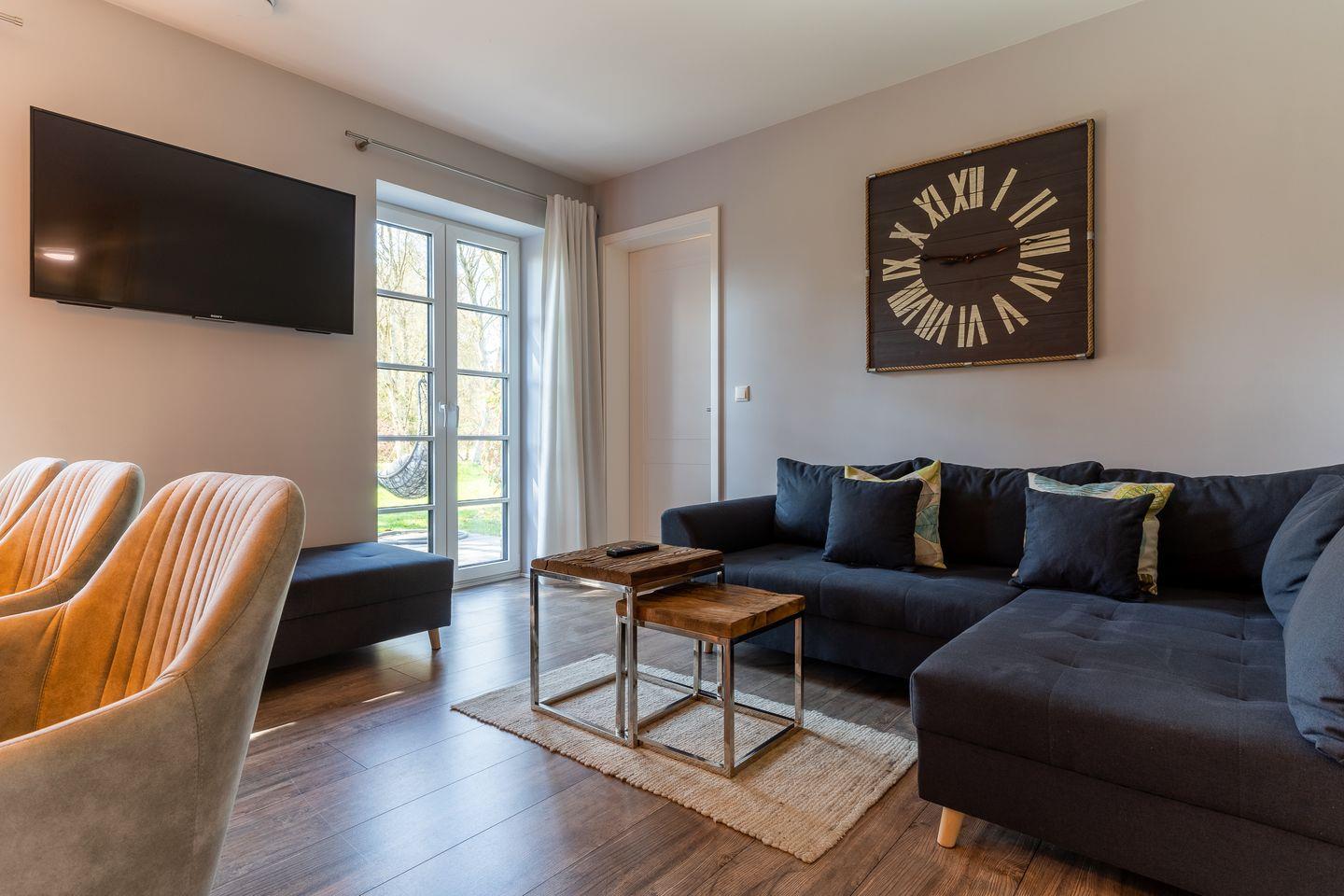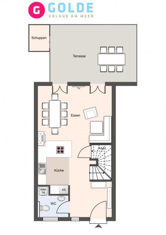 Die luxuriöse Haushälfte verfügt über ca. 105 m² Wohnfläche und bietet großzügigen Platz für 6 Personen. Im Erdgeschoss befindet sich der moderne Wohnbereich mit TV, Kamin, einer offenen Küche sowie einem stilvollen Essbereich. Die Wohnräume sind mit exklusiven Möbeln ausgestattet. Die Küche verfügt über hochwertige Elektrogeräte. An den Wohnbereich schließen sich ein Flur mit eingebauter Garderobe, ein Abstellraum und ein Gästebad an. Das gesamte Erdgeschoss ist mit geschmackvollen Fußbodenbelegen versehen, die über eine Fußbodenheizung beheizt werden können.