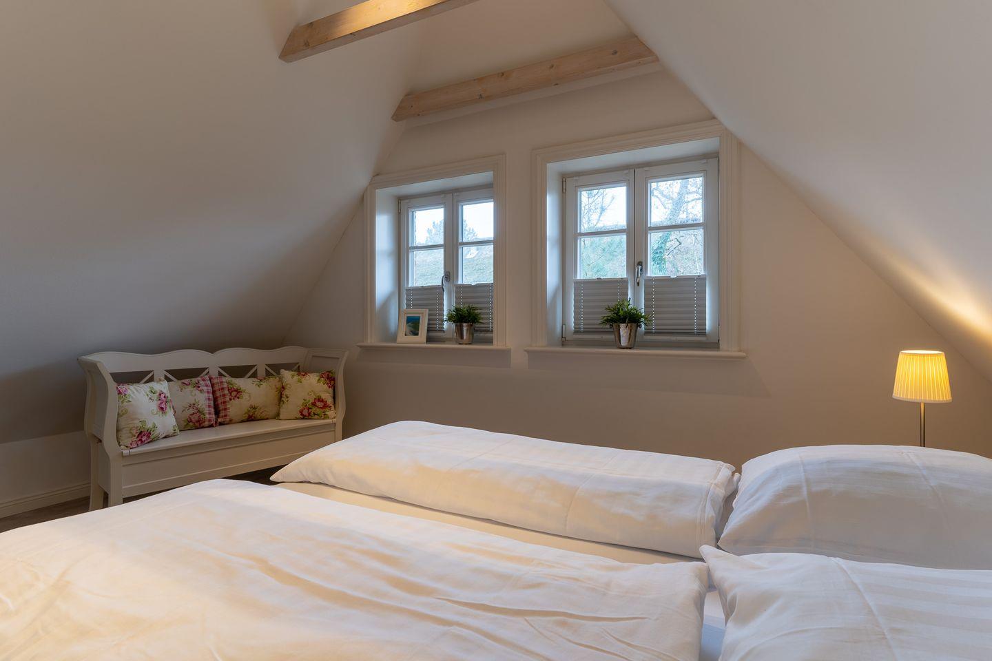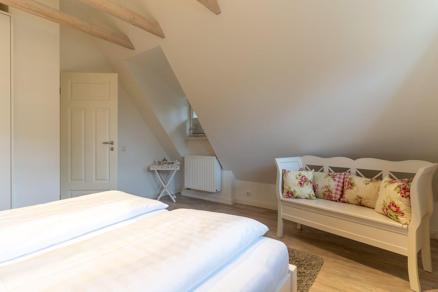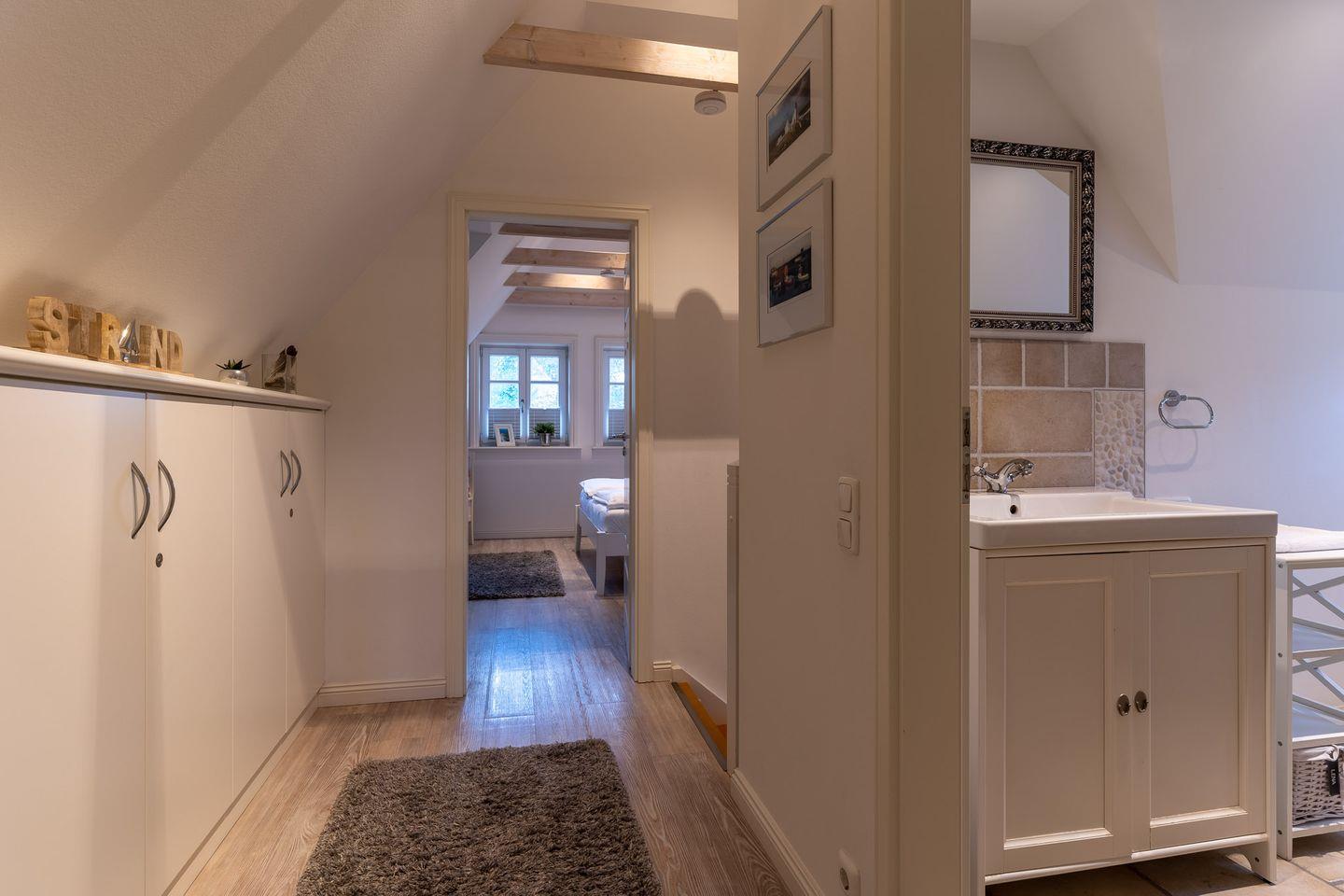 Über den geräumigen Flur gelangen Sie über eine wunderschöne Holztreppe in das Obergeschoss. Hier sind zwei weitere gemütliche Schlafzimmer. Fallen lassen und abschalten.