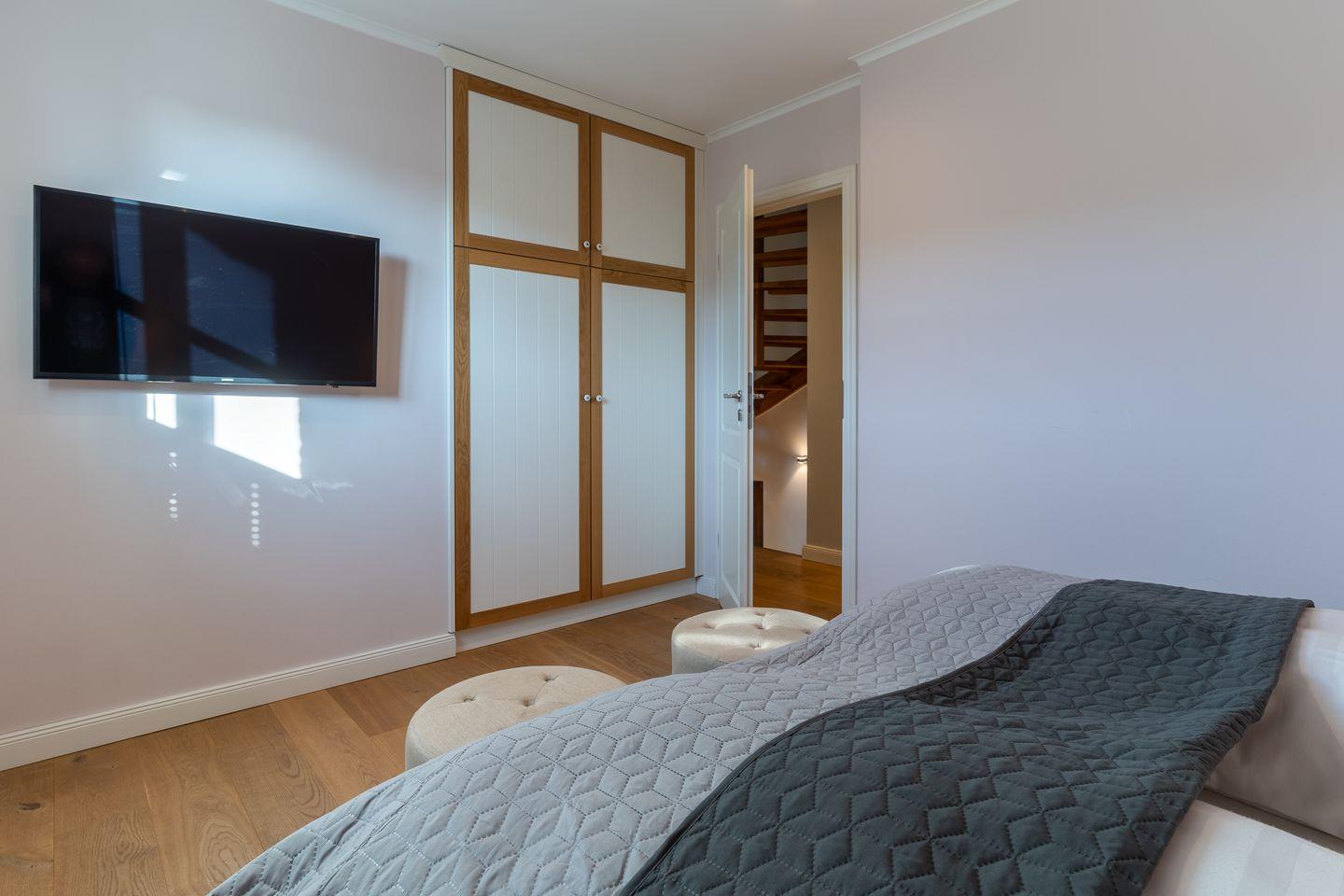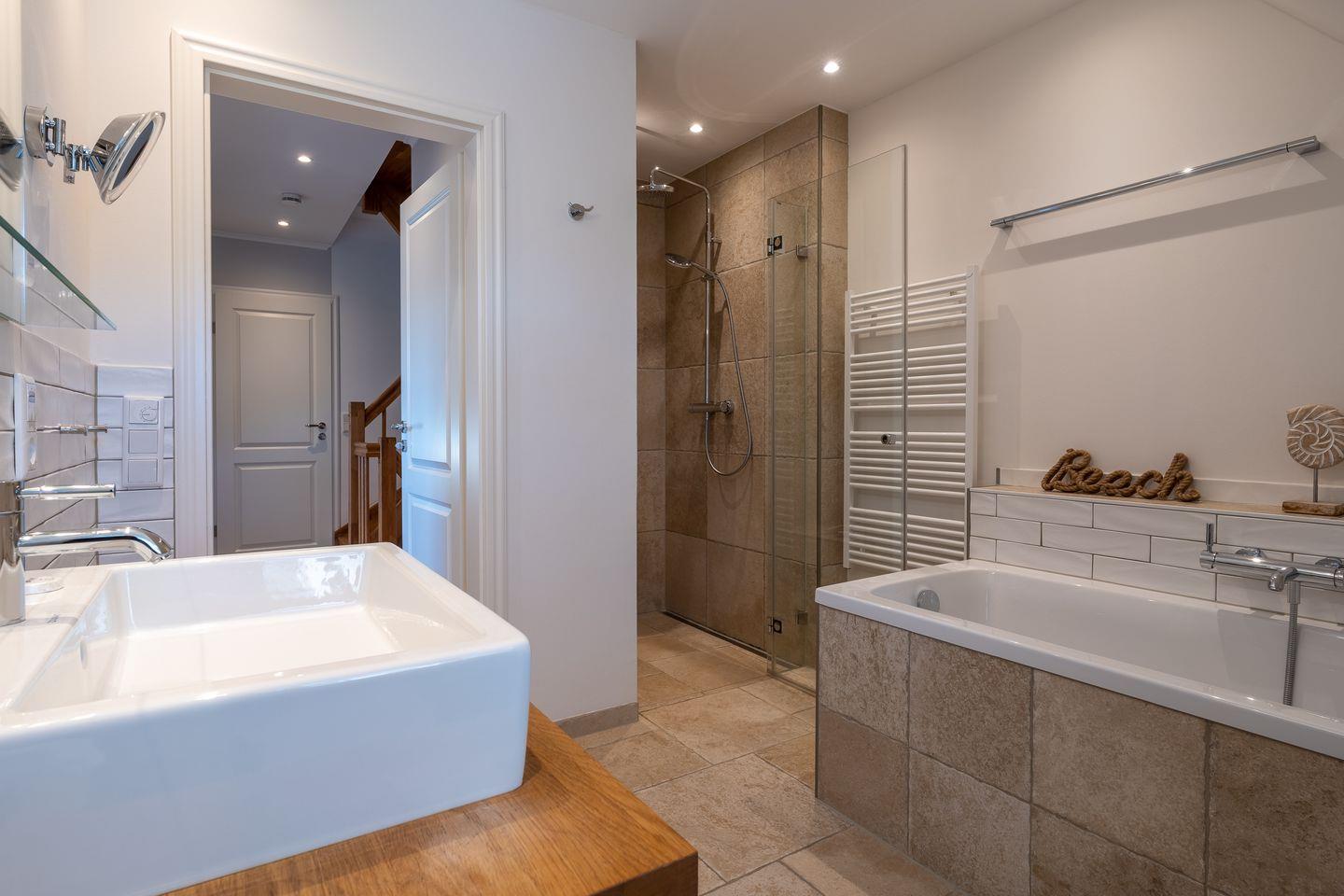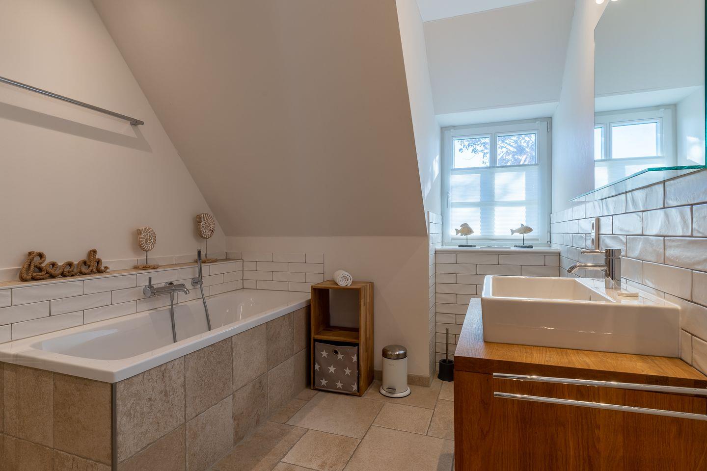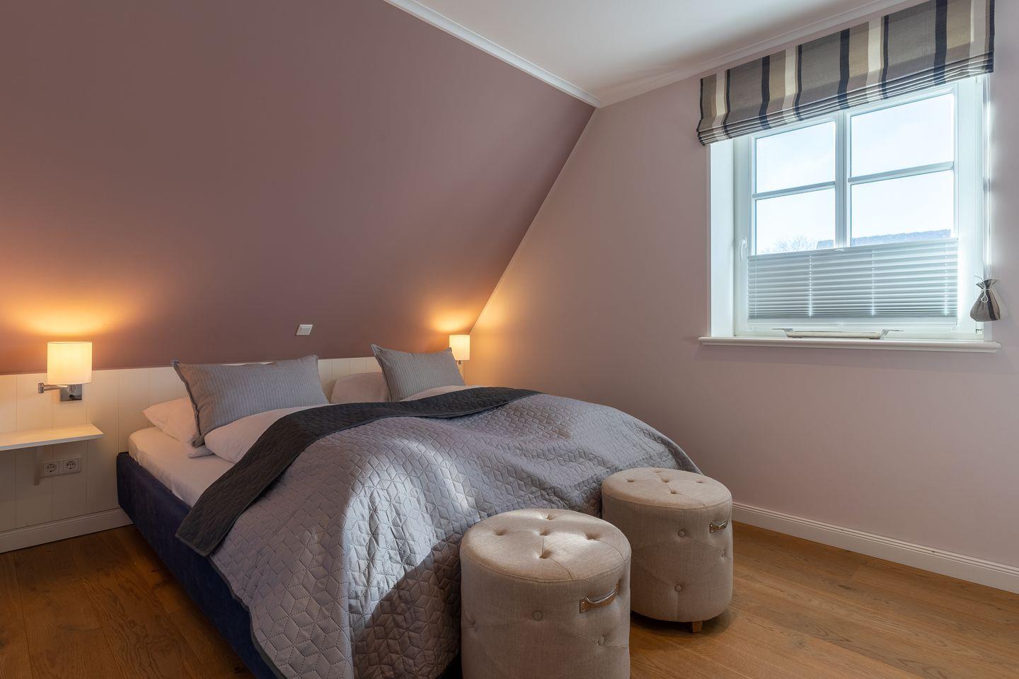 Über eine Holztreppe gelangt man in das mit Parkett ausgelegte Obergeschoss. Dieses verfügt ebenfalls über eine Fußbodenheizung. Die beiden Schlafzimmer sind jeweils mit einem Doppelbett ausgestattet. Einbauschränke gewähren Ihnen hinreichend Ablageflächen. Darüber hinaus befindet sich im Obergeschoss ein weiteres, geräumiges Bad mit Dusche und Badewanne. Vom Obergeschoss führt die Holztreppe hinauf in das Dachgeschoss. Hier befindet sich ein zusätzliches Schlafzimmer mit 2 Einzelbetten. Dieses wunderschöne Haus lässt keine Wünsche offen und bringt Sie sofort in Urlaubsstimmung.