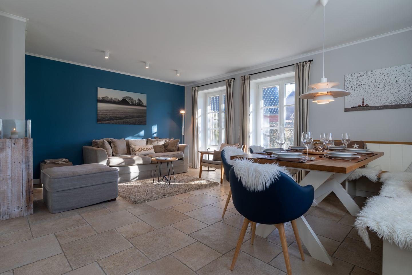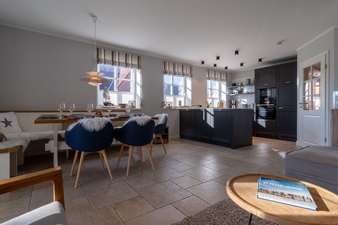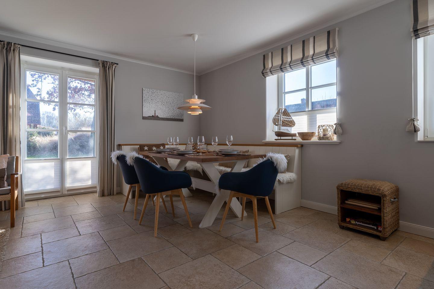 Die luxuriöse Haushälfte unter Reet verfügt über ca. 108 m² Wohnfläche und bietet Platz für 6 Personen. Im Erdgeschoss befindet sich der lichtdurchflutete Wohnraum mit TV, einer offenen Küche sowie einem stilvollen Essbereich. Die Wohnräume sind mit hochwertigen Möbeln und wundschönen Tischlerarbeiten ausgestattet. Die Küche verfügt über hochwertige Elektrogeräte und ist voll ausgestattet. An den Wohnbereich schließen sich ein Flur mit Garderobe, ein Hauswirtschaftsraum und ein Duschbad an. Das gesamte Erdgeschoss verfügt über geschmackvolle Fußbodenfliesen, die über eine Fußbodenheizung beheizt werden können.