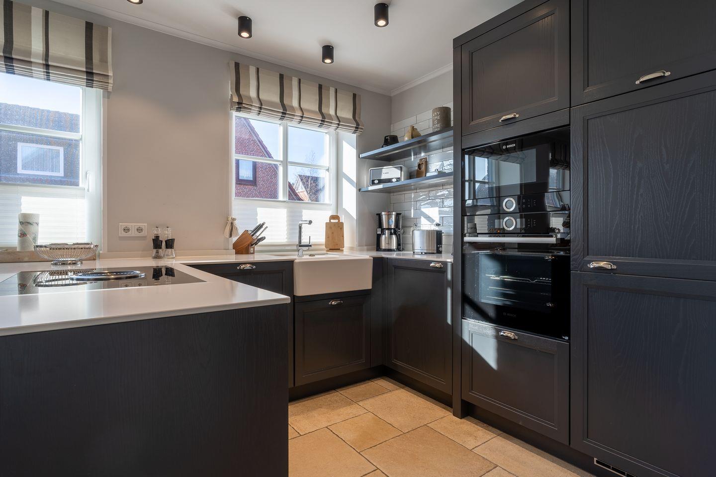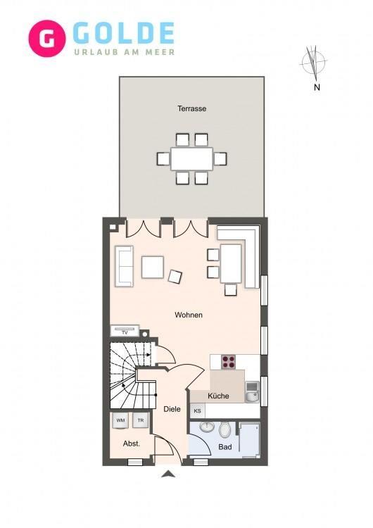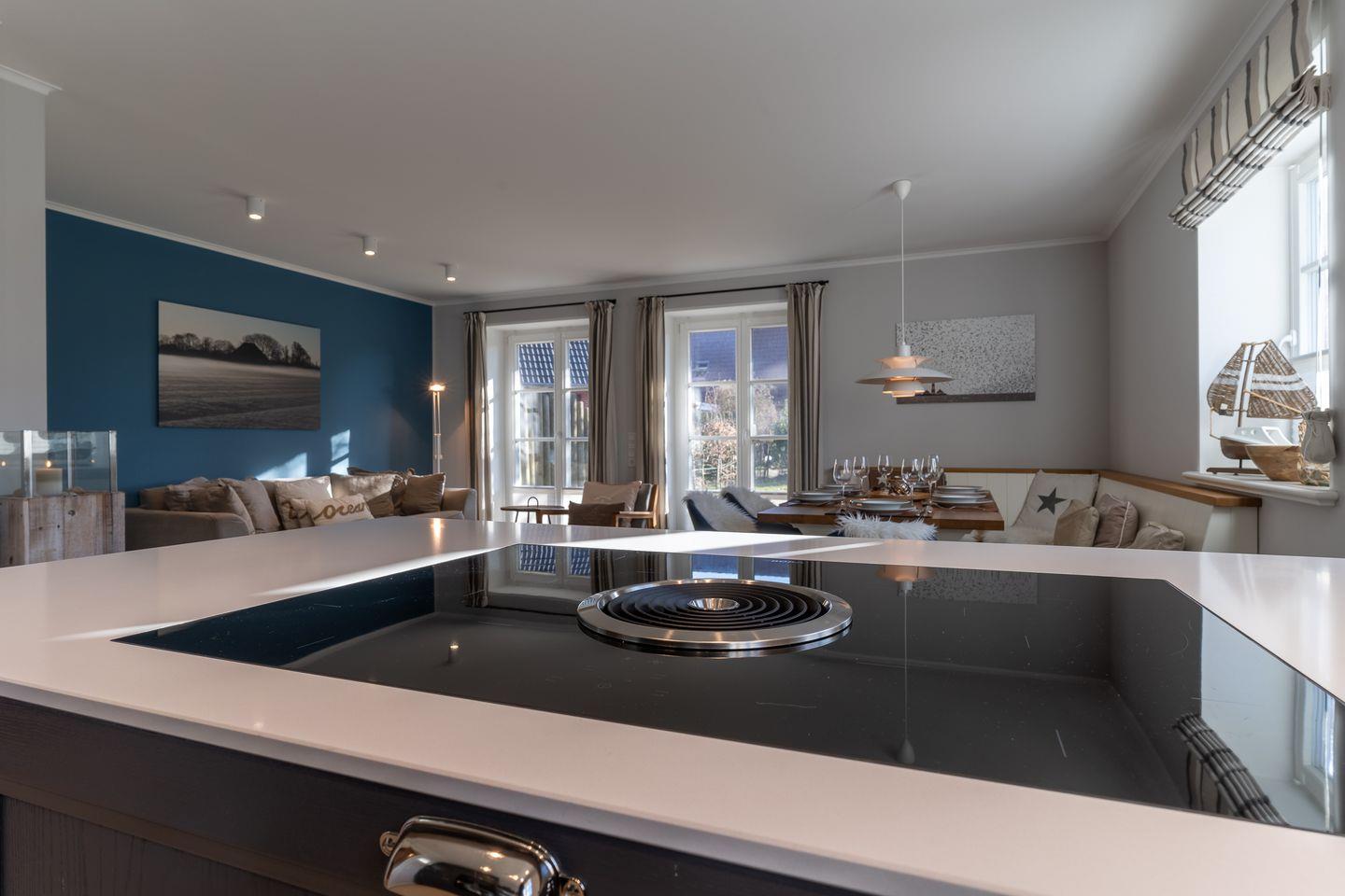 Die luxuriöse Haushälfte unter Reet verfügt über ca. 108 m² Wohnfläche und bietet Platz für 6 Personen. Im Erdgeschoss befindet sich der lichtdurchflutete Wohnraum mit TV, einer offenen Küche sowie einem stilvollen Essbereich. Die Wohnräume sind mit hochwertigen Möbeln und wundschönen Tischlerarbeiten ausgestattet. Die Küche verfügt über hochwertige Elektrogeräte und ist voll ausgestattet. An den Wohnbereich schließen sich ein Flur mit Garderobe, ein Hauswirtschaftsraum und ein Duschbad an. Das gesamte Erdgeschoss verfügt über geschmackvolle Fußbodenfliesen, die über eine Fußbodenheizung beheizt werden können.