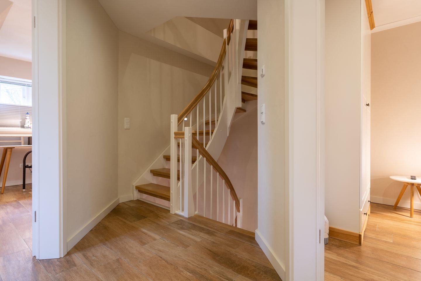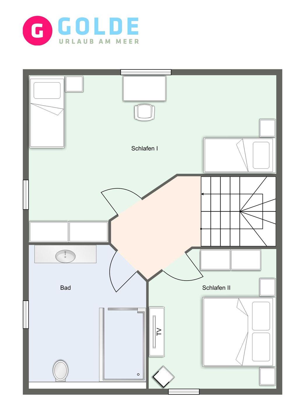 Über eine Holztreppe gelangt man in das Obergeschoss mit zwei Schlafzimmern. Eines mit einem 180er Doppelbett und TV und das Anderes mit 2x 90er Einzelbetten. Außerdem ist im OG ein modernes Duschbad.