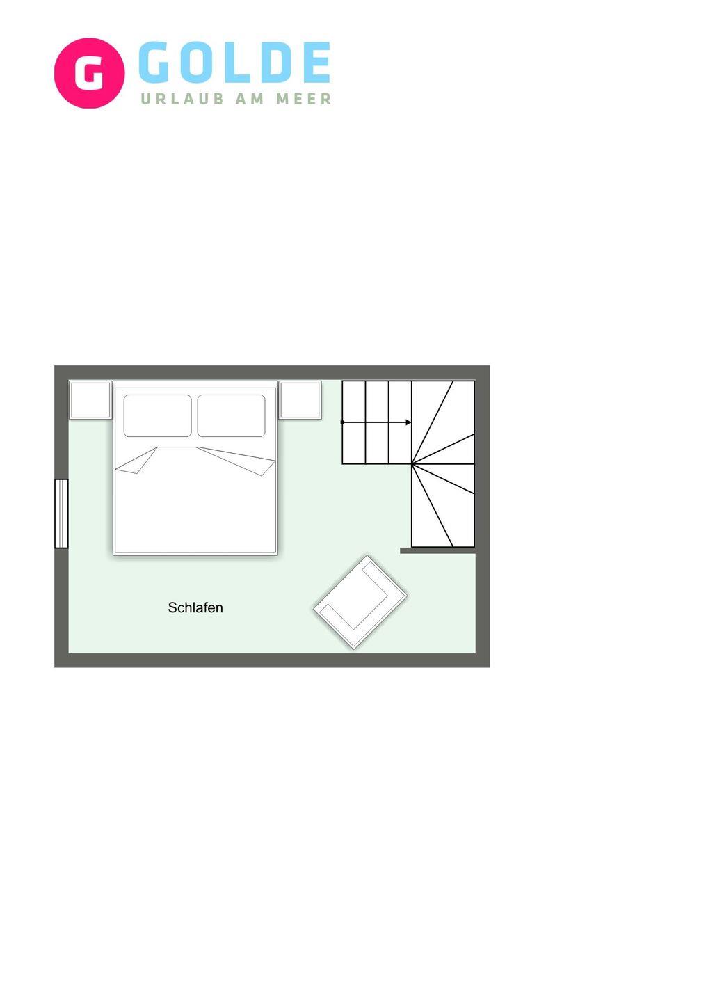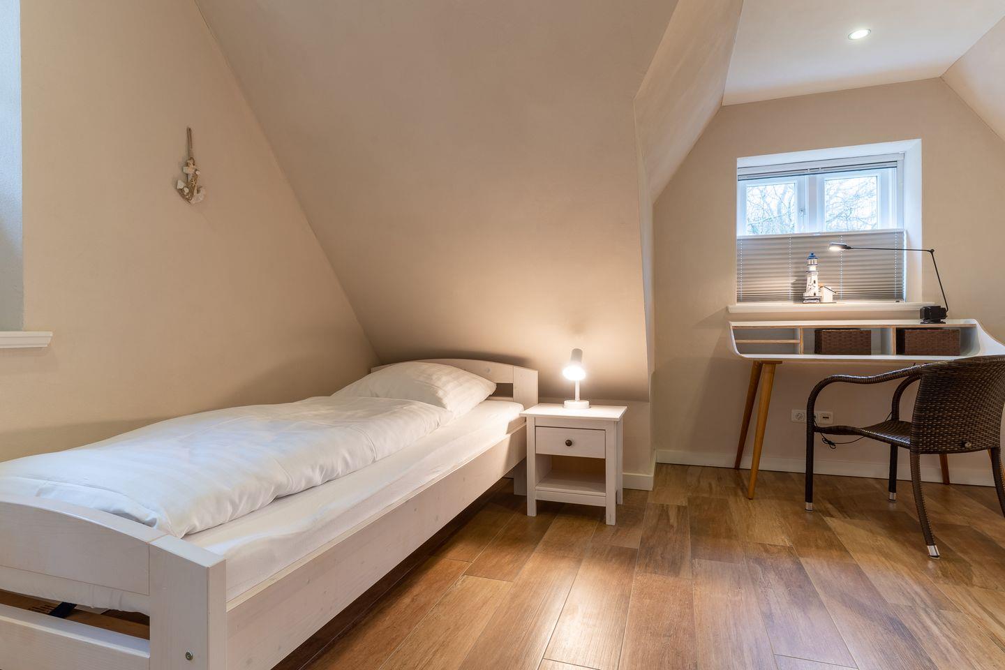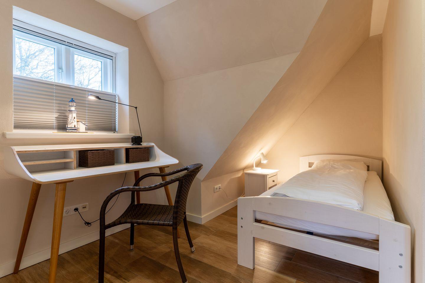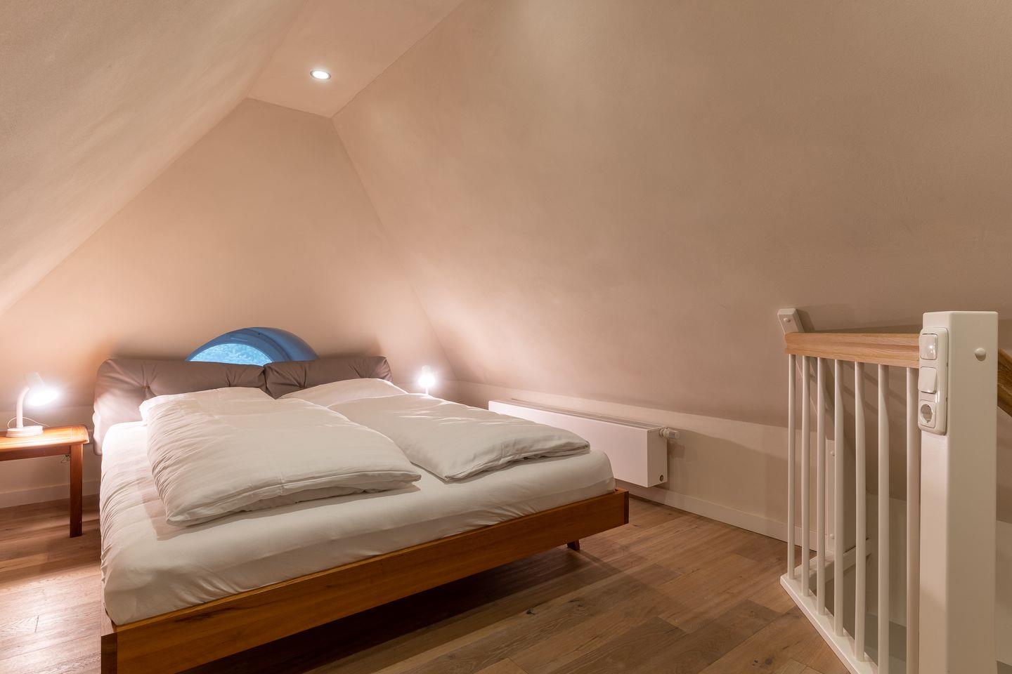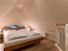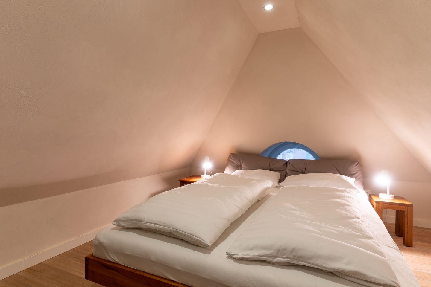Über eine weitere Holztreppe geht es vom Flur ins Dachgeschoss mit einem gemütlichen 160er Doppelbett.