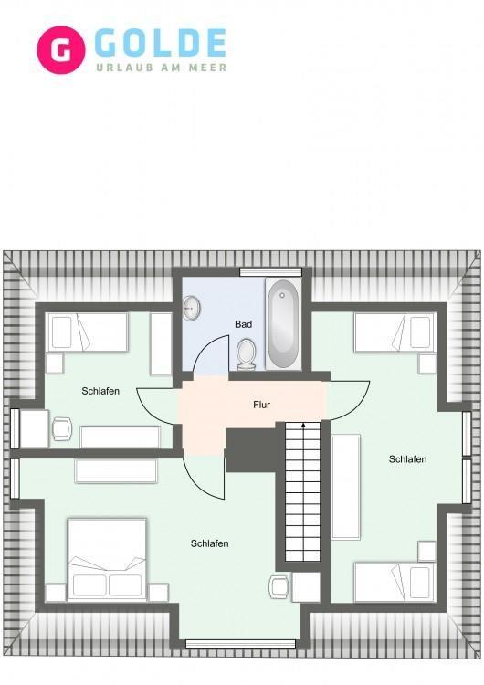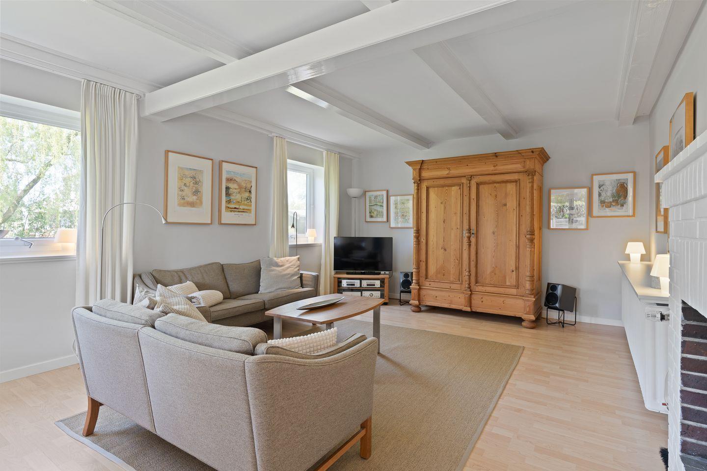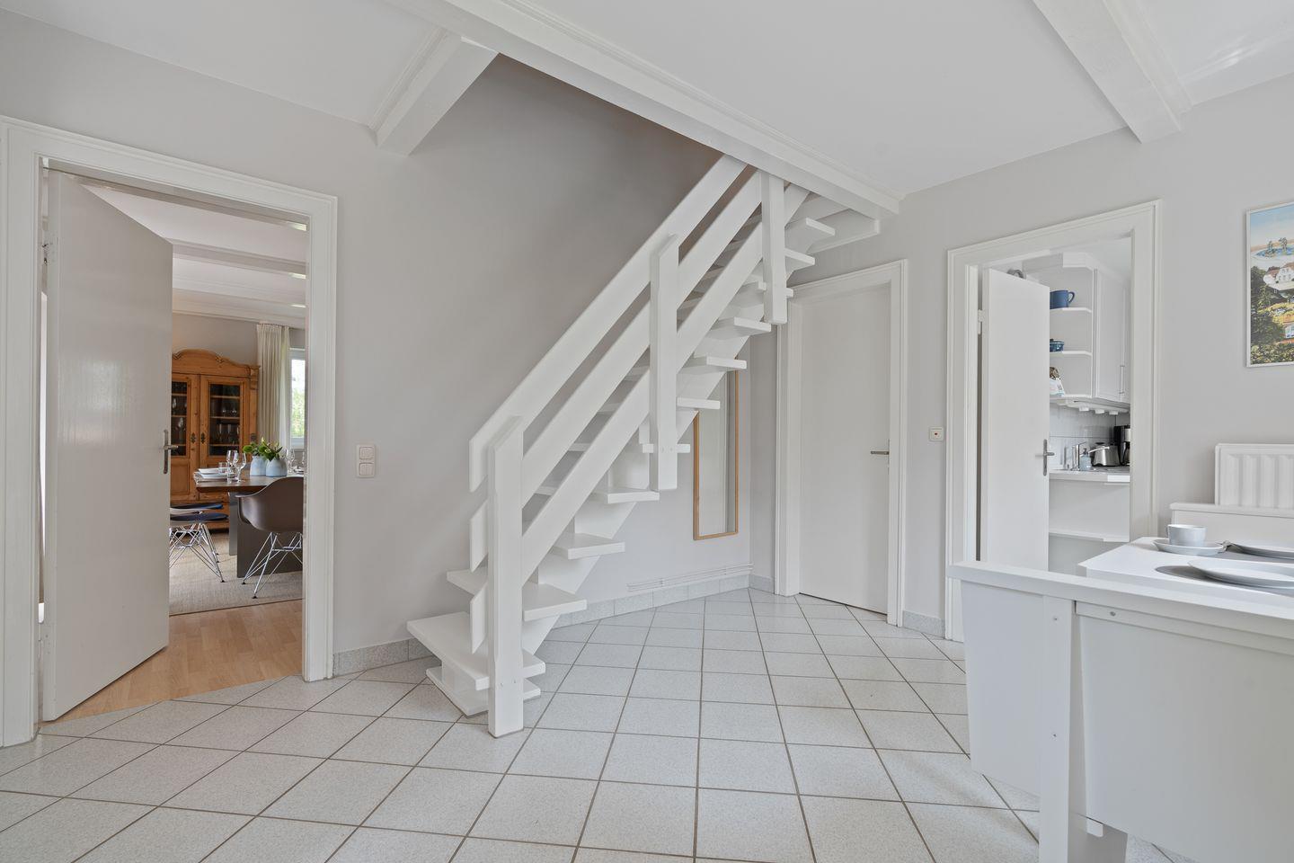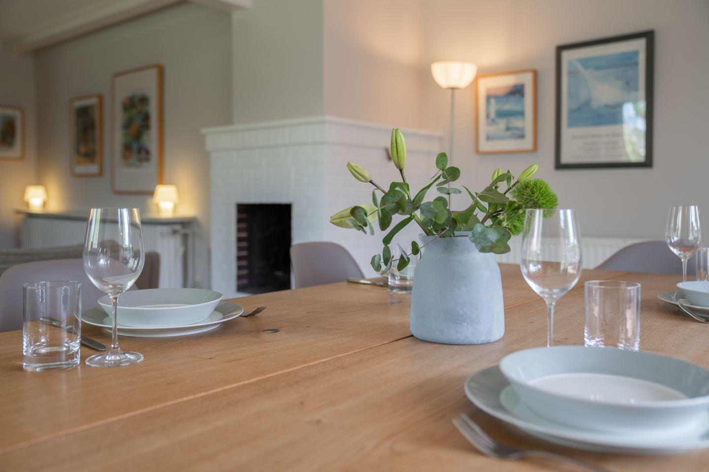 Im Erdgeschoss befindet sich der Wohnraum mit einem gemütlichen Essbereich und Zugang zur Terrasse. Ein Kamin im Wohnraum bietet ebenso einen warmen Charakter. Die separate Küche ist mit allen wichtigen Geräten voll ausgestattet. Im Erdgeschoss ist ebenso ein Duschbad mit Gäste-WC. Im Empfangsgereicht ist ein Flur mit Garderobe und einer weiteren Sitzecke, von hier aus gelangt man in das Obergeschoss. Hier befinden sich 3 Schlafzimmer: ein Doppelschlafzimmer mit 1x Doppelbett, ein Doppelschlafzimmer mit 2x Einzelbetten und ein Schlafzimmer mit 1x Einzelbett. Große Fenster sorgen für viel Licht. Außerdem ist im Obergeschoss ein Bad mit Badewanne.