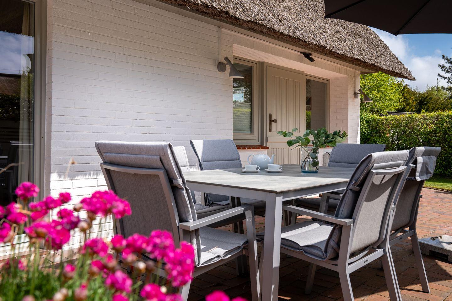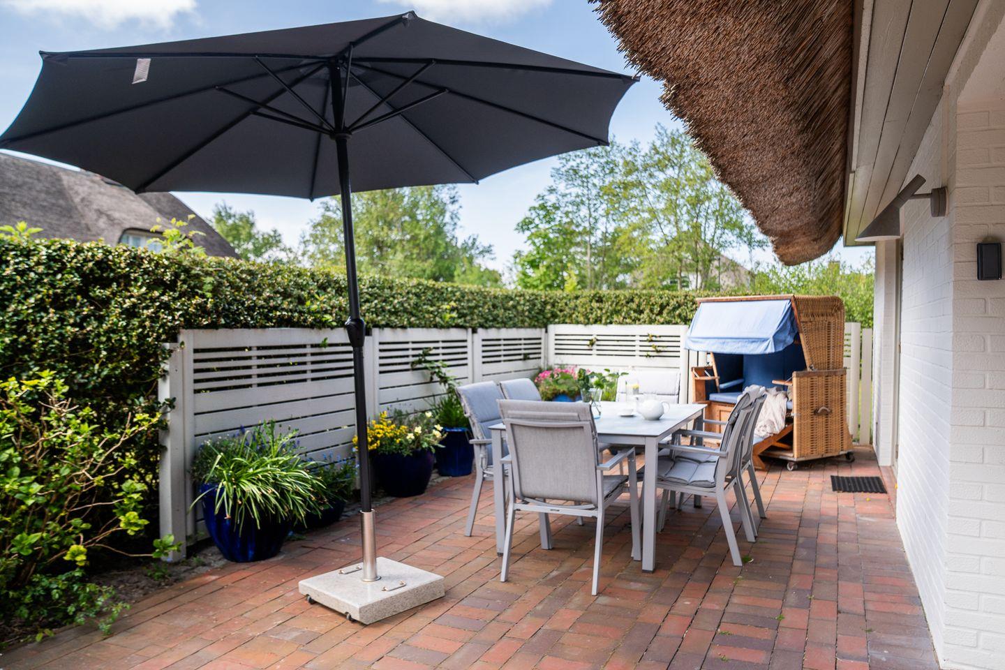 In dem wunderschönen, großzügigen und liebevoll angelegten Garten und der gemütlichen Terrasse können Sie Ihren Urlaub ab der 1. Minute genießen. Gartenmöbel und ein Strandkorb laden Sie zur Erholung ein.