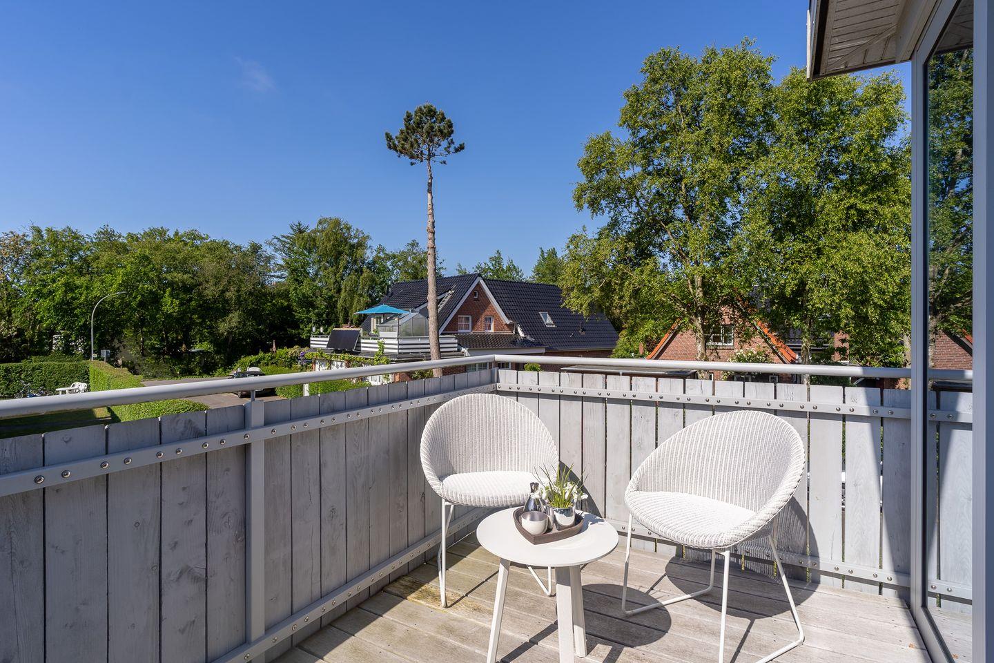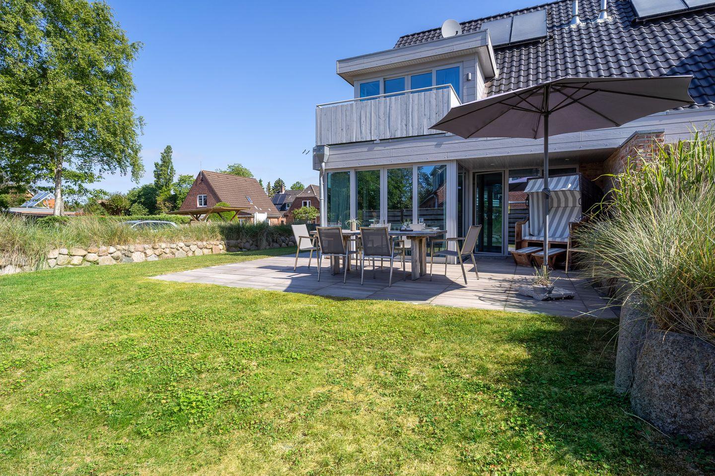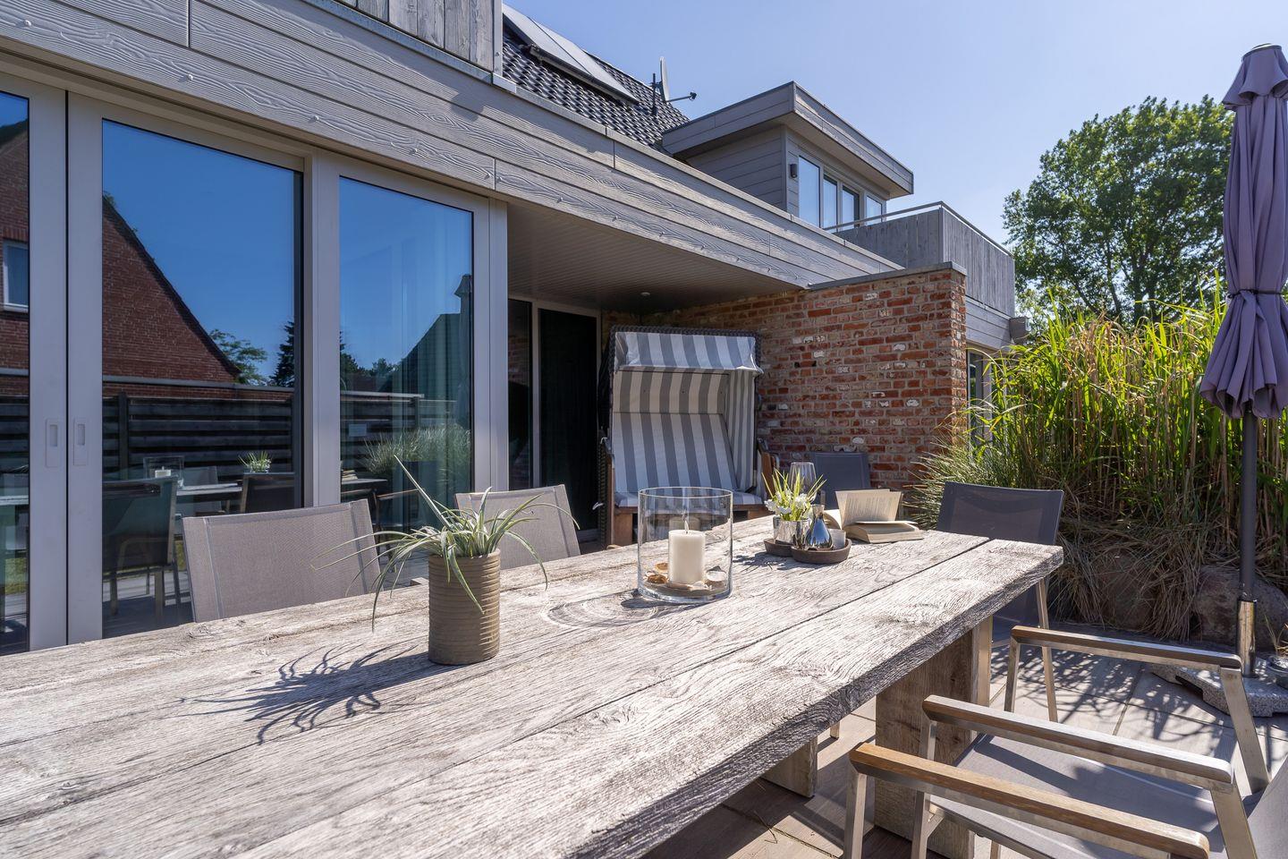 Das Grundstück mit Stellplatz, Abstellraum, Garten und einer großzügigen geschützten Terrasse inklusive edlen Gartenmöbeln ist mit hübschen Pflanzen und einem Friesenwall angelegt.