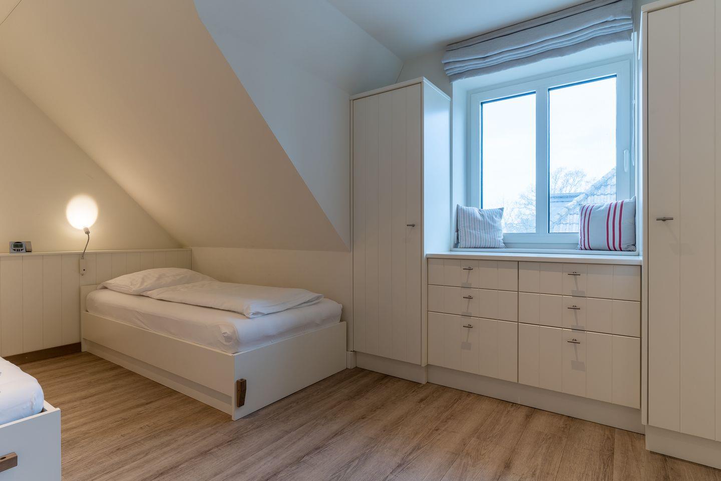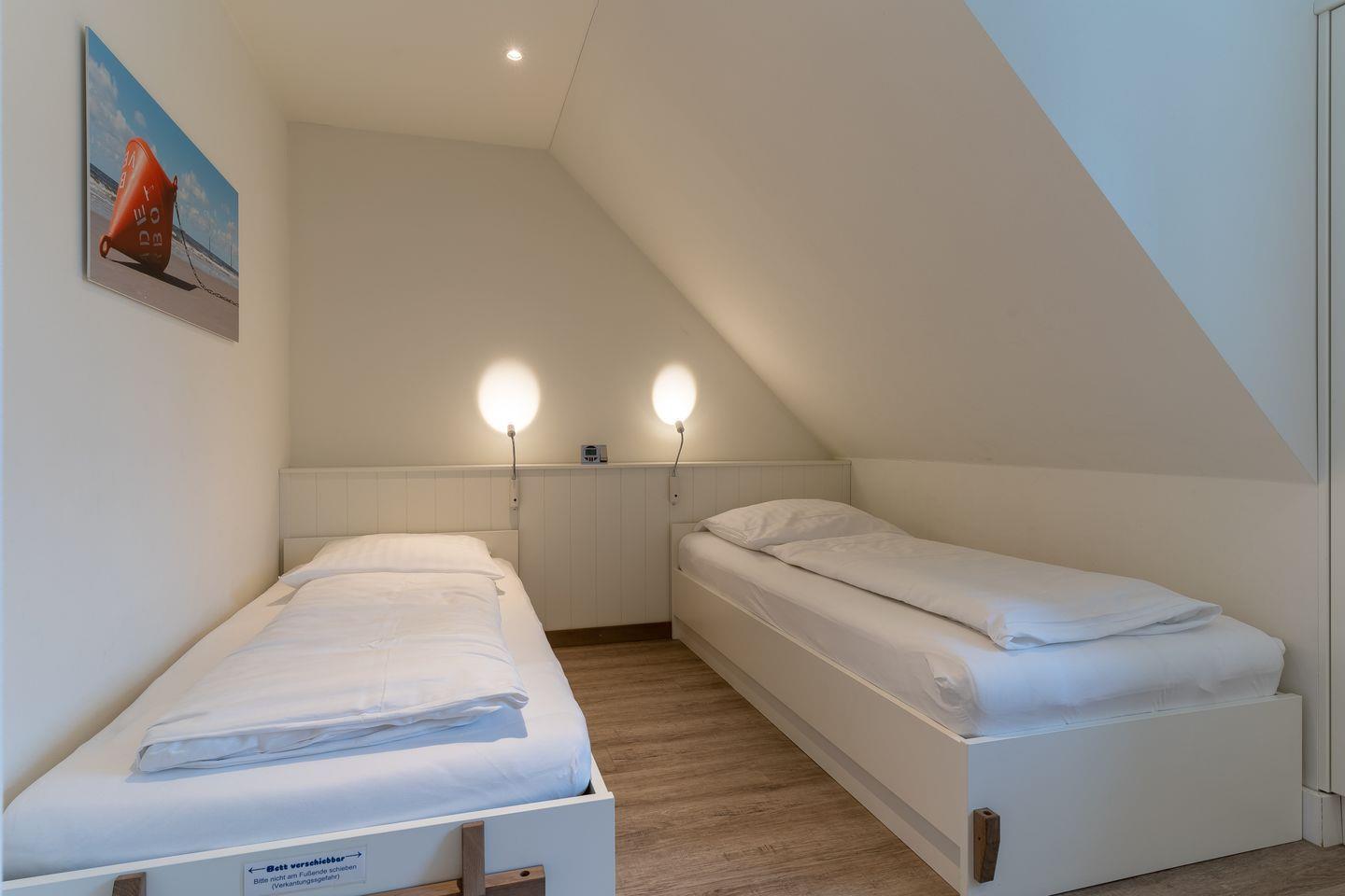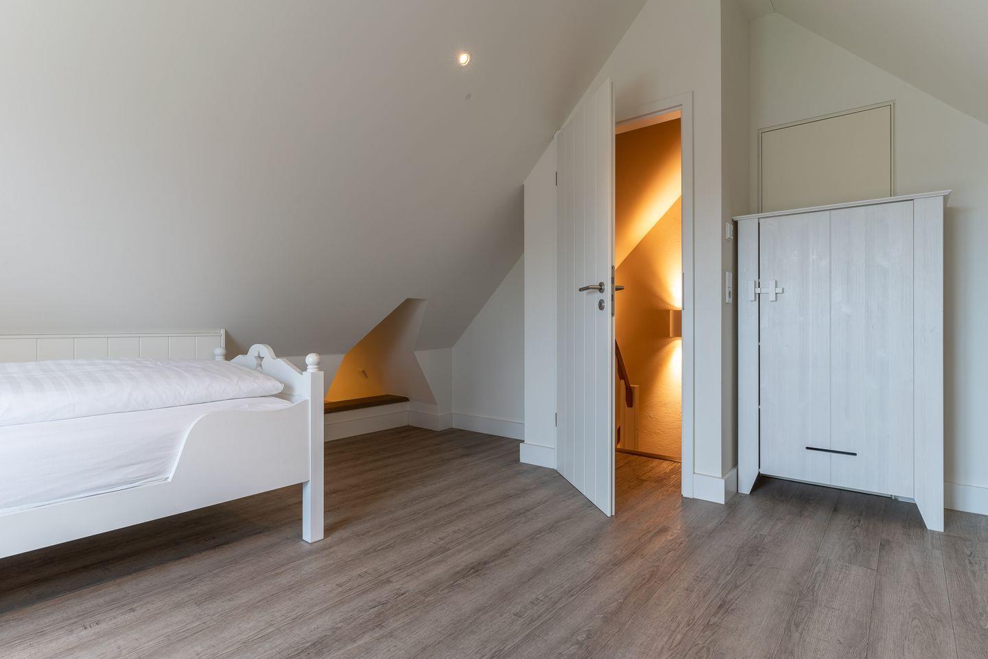 Über eine weitere Holztreppe geht es vom Flur ins Dachgeschoss mit einem weiteren Zimmer mit 2 Einzelbetten.