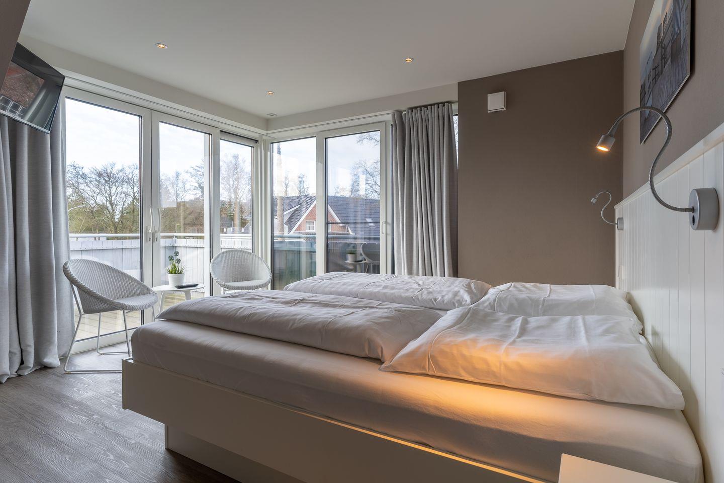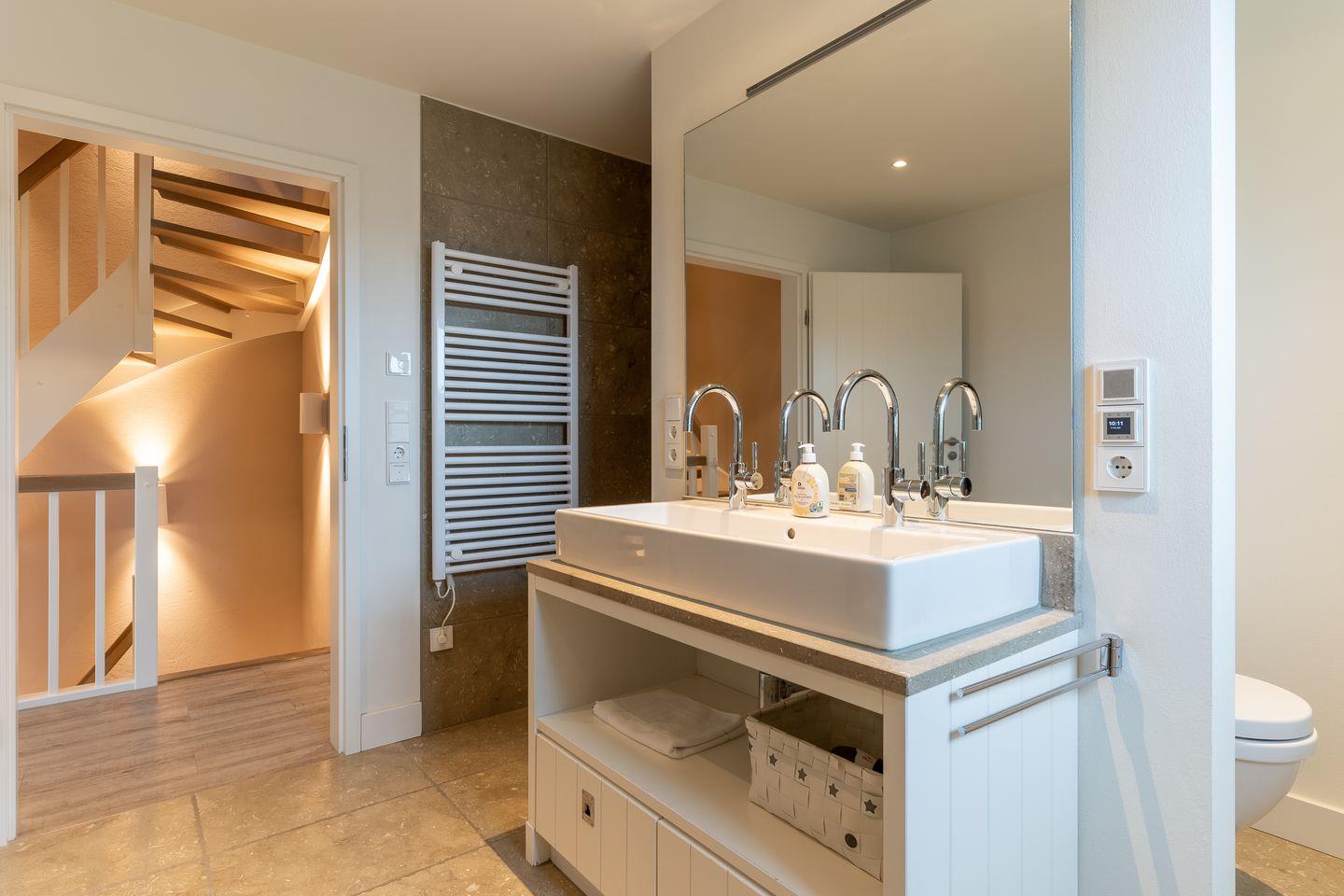 Über eine Holztreppe gelangt man in das Obergeschoss mit zwei großzügigen Schlafzimmern, ein Doppelschlafzimmer mit TV und großem Einbauschrank und ein Dreibettzimmer mit einem Einzelbett, sowie 2 weiteren Einzelbetten, diese können jedoch mit einem Klick zu einem Doppelbett umgewandelt werden. Durchdacht bis ins letzte Detail. Im OG ist außerdem noch ein 3. Bad - ein Vollbad mit Dusche und Badewanne.