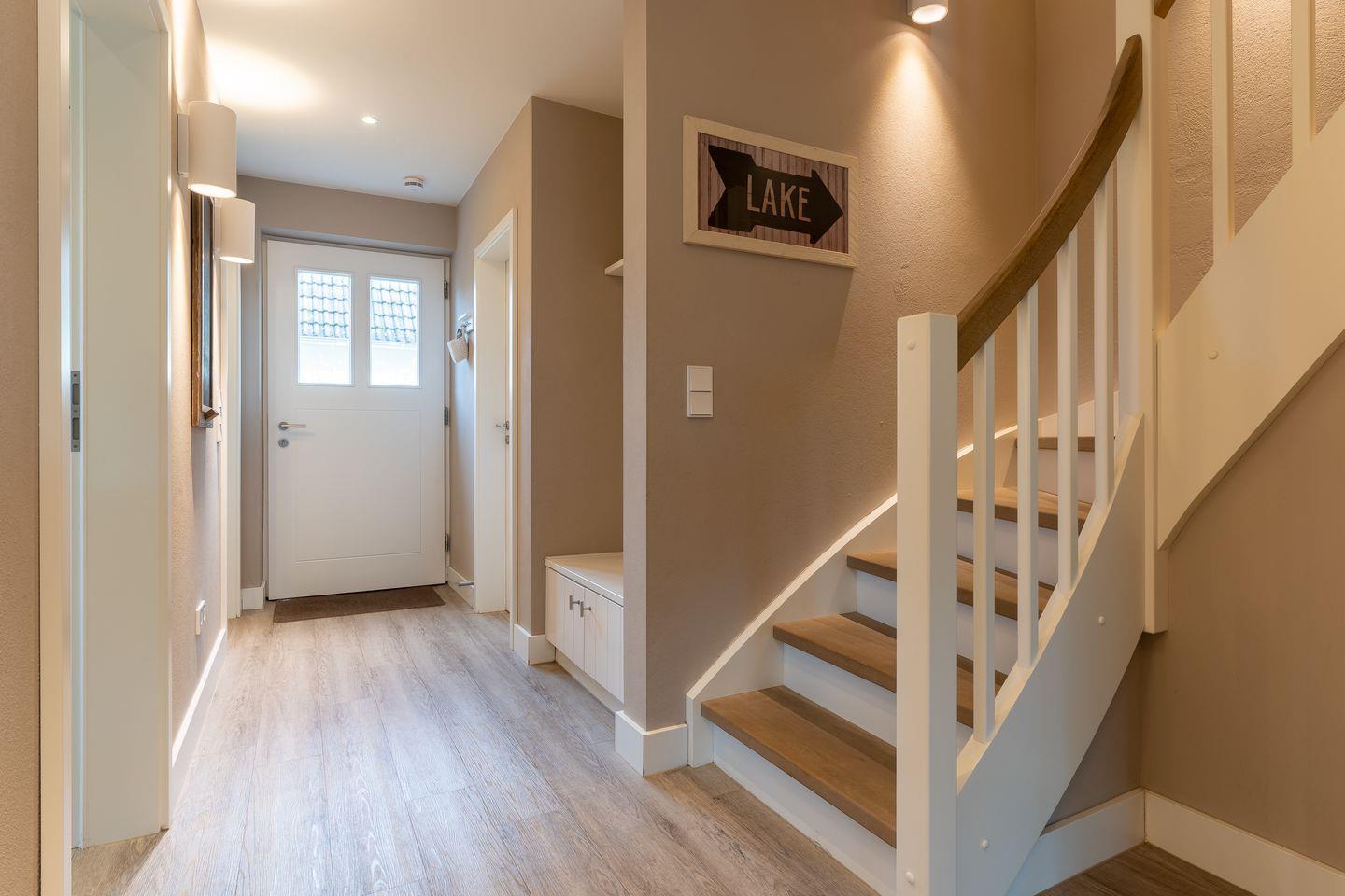 Im Erdgeschoss befindet sich der lichtdurchflutete Wohnraum mit einer offenen Küche, einem Gaskamin und einem gemütlichen Essbereich. Die Küche ist mit hochwertigen Geräten voll ausgestattet. Im Erdgeschoss ist ebenso ein großer Flur mit eingebauter Garderobe, ein Hauswirtschaftsraum und ein großzügiges Gästebad. Außerdem ein Duschbad mit einer großzügigen Sauna. Die Sauna ist mit entspannter Hintergrundmusik, Beleuchtung und jeglichem Komfort.