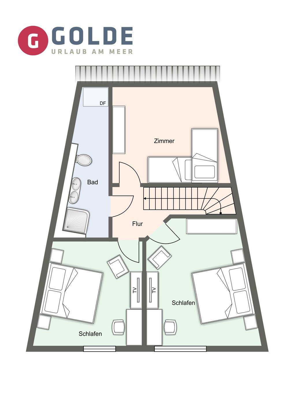 Über eine Treppe aus dem Wohnraum gelangt man in das Obergeschoss. Hier sind zwei großzügige Schlafzimmer mit jeweils einem Boxspringbett (180 x 210cm) + (180 x 200cm) + (1x mit TV). Das dritte Schlafzimmer hat ein gemütliches Etagenbett (2x 90x200cm). Außerm ist noch ein weiteres Duschbad vorhanden.