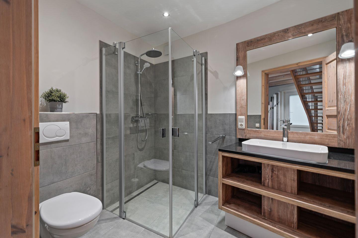 Im Erdgeschoss befindet sich ein großzügiger Wohnraum mit TV und einer modernen Wohnküche. Die Küche verfügt über hochwertige Elektrogeräte, eine Pad-Kaffeemaschine und eine Filter- Kaffeemaschine.