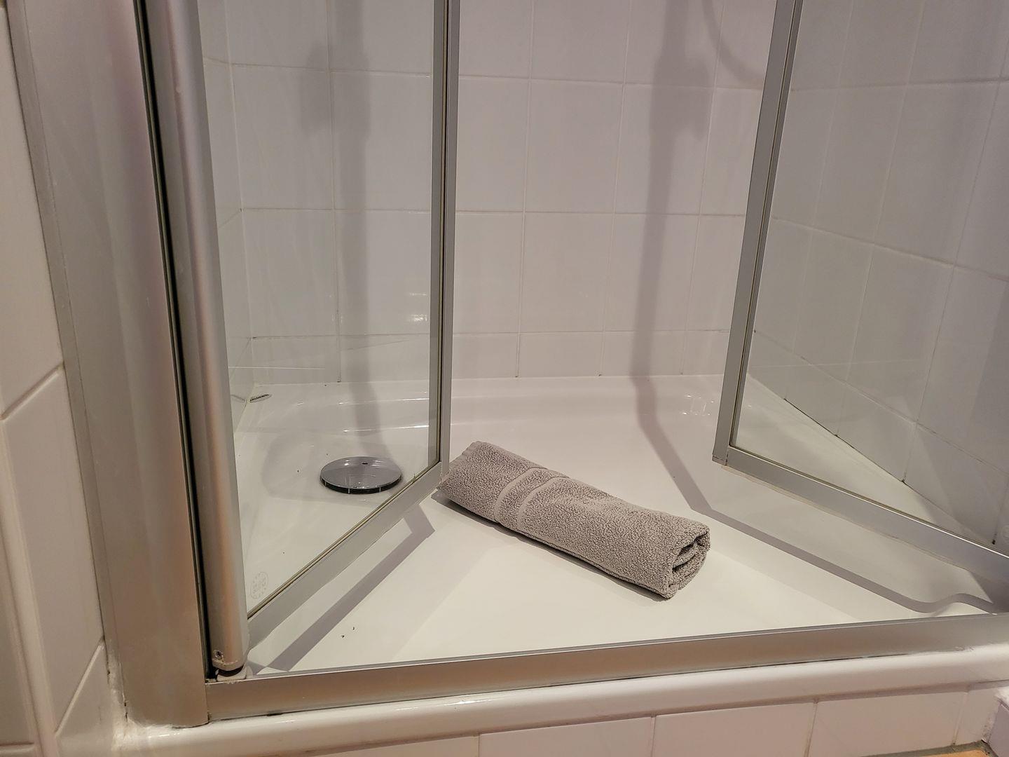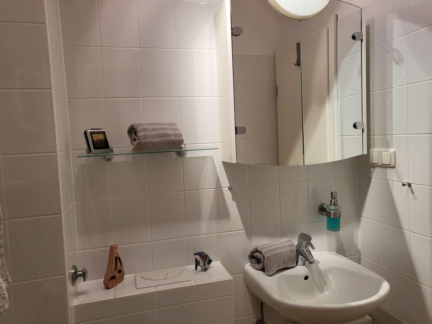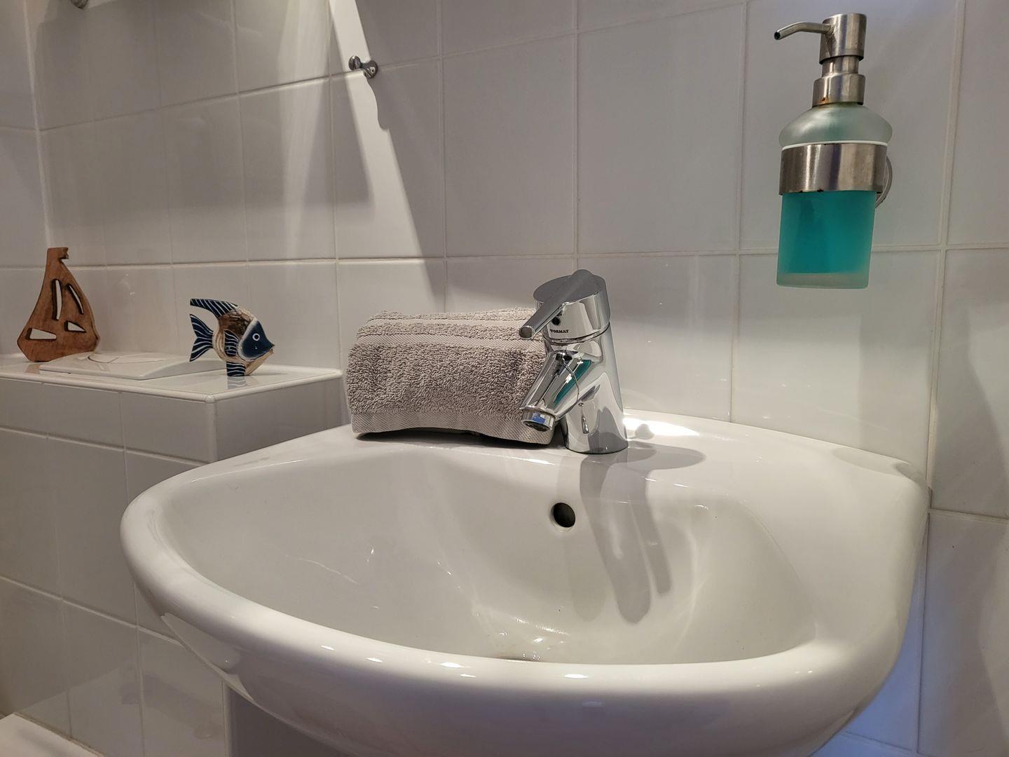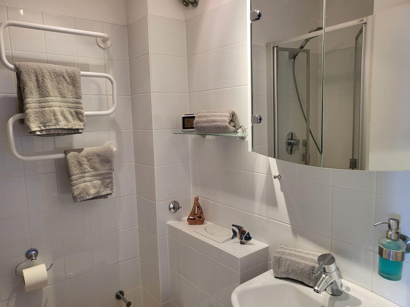 Zur Ferienwohnung gehört zudem ein Duschbad mit WC, die mit Fußbodenheizung und elektrischem Handtuchtrockner ausgestattet ist.