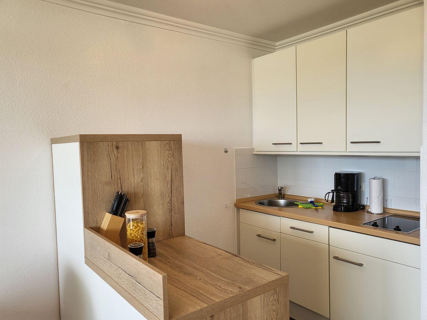 Hier stehen unter anderem Kochfeld und Mikrowelle sowie Kühlschrank mit Gefrierfach, Geschirrspüler und Kaffeemaschine zur Verfügung.